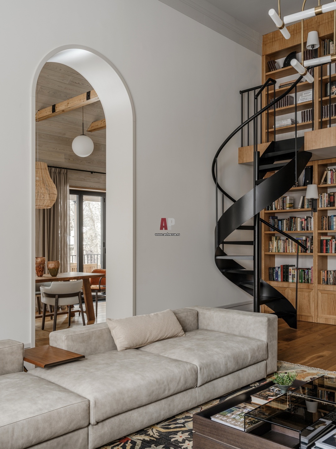 Дом в средиземноморском стиле. Гостиная с двухуровневой библиотекой.