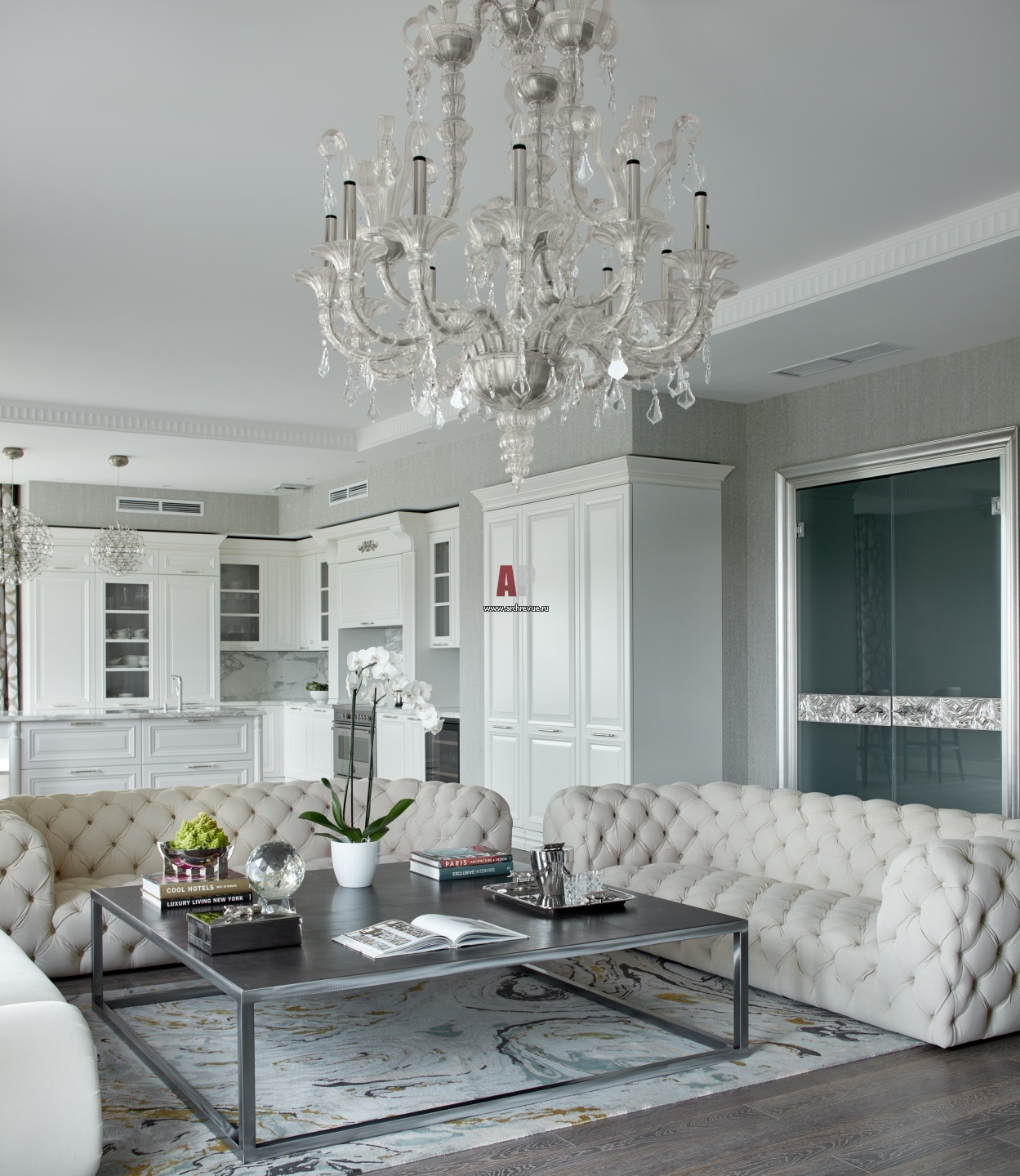 Общая гостиная укомплектована функциональной кухней с профессиональной техникой.