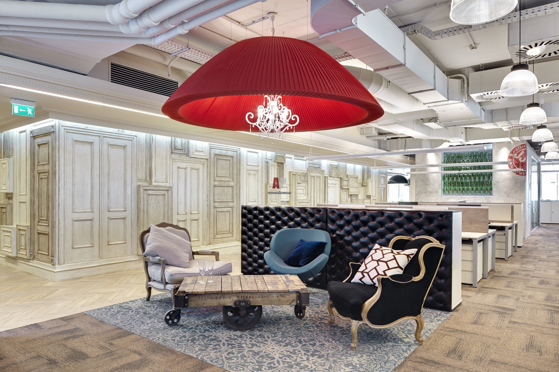 Стены на рабочем этаже отделаны разноформатными кессонами из состаренного дерева. Паркет уложен «елочкой». Зона отдыха сотрудников выделена светильником с огромным красным абажуром.