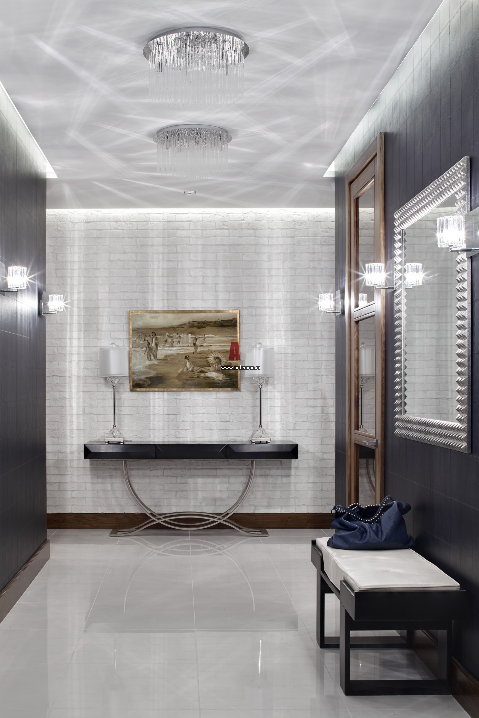 Прихожая – самое контрастное помещение в квартире: две ее стены облицованы панелями из матовой кожи черного цвета, одна – выложена белой плиткой с имитацией кирпичной кладки. Хрусталь светильников отражается в глянцевом крупноформатном покрытии пола. Черная на металлическом основании консоль, Swaim.