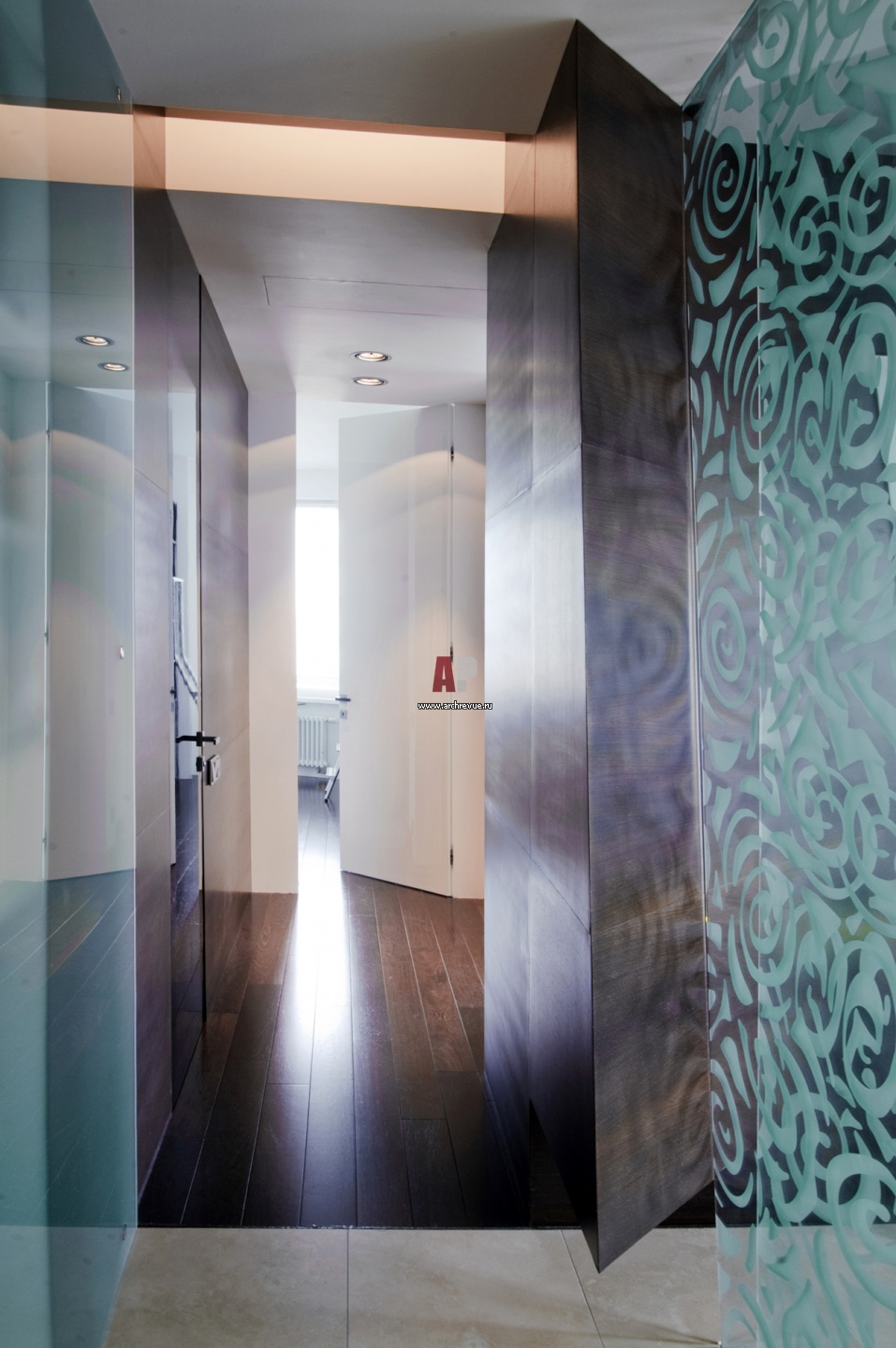 Коридор с элементами деконструктивизма. Авторы проекта Петр Зайцев, Арсений Борисенко, архитектурное бюро za bor. Формы, облицованные деревом, сочетаются с перегородками из стекла.