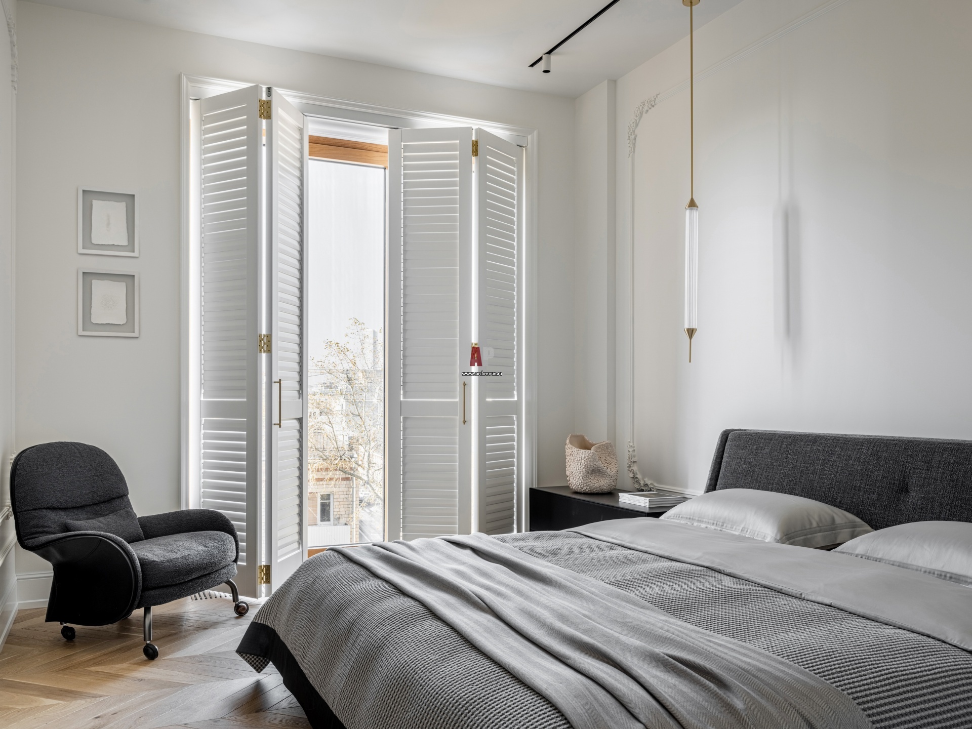Хозяйская спальня сделана белой. Кровать, Minotti. Кресло, De Padova. Ставни-шаттерсы, дерево, белая эмаль, изготовлены на заказ.