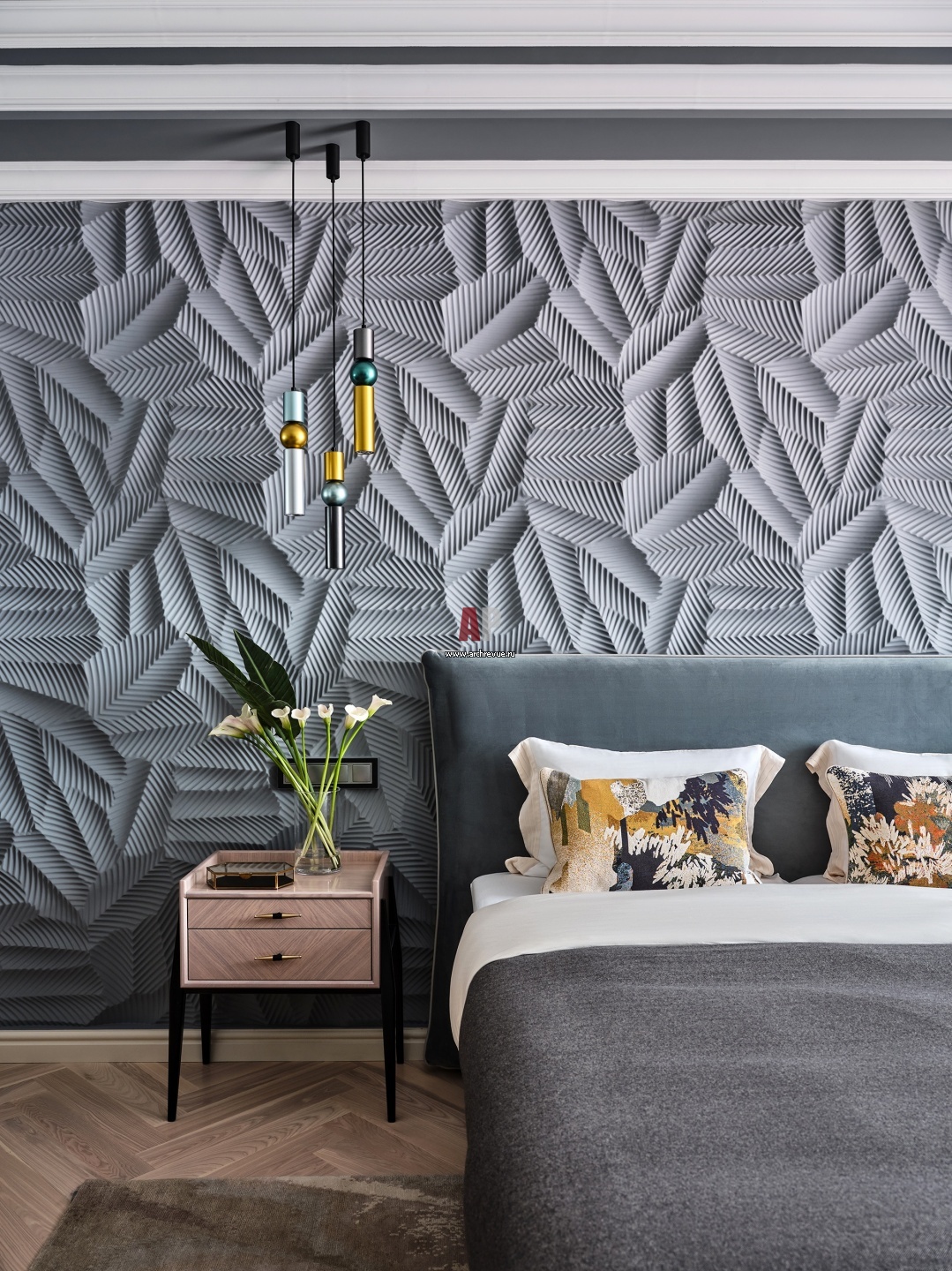Разноцветный дом в Новой Москве. Интерьер хозяйской спальни. Акцент – 3D-стена из гипса с имитацией отпечатков листьев.