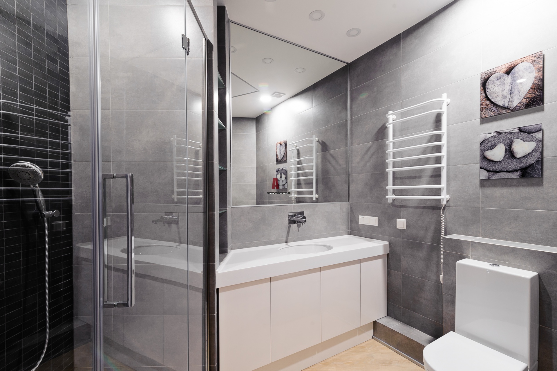 Стены в санузле облицованы плиткой с имитацией бетона. Угловая душевая кабина в строительном исполнении. Умывальник сделан на заказ, столешница с острым углом сделана из искусственного камня белого цвета. Смесители, Hansgrohe.