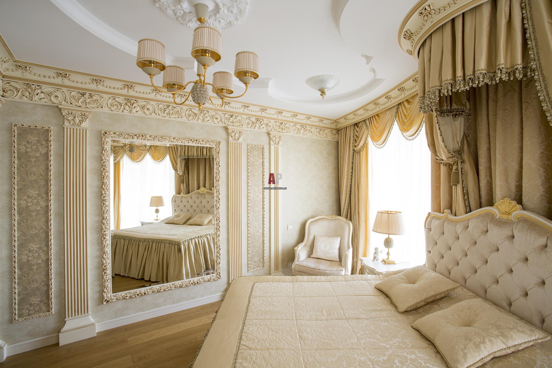Хозяйская спальня – самое роскошное помещение в квартире. Золотистый интерьер украшен резными пилястрами с позолотой, а также деревянными и гипсовыми карнизами. Кровать Angelo Cappellini оформлена балдахином на манер исторического декора покоев французских королей. Большое зеркало в золотой раме зрительно увеличивает помещение.