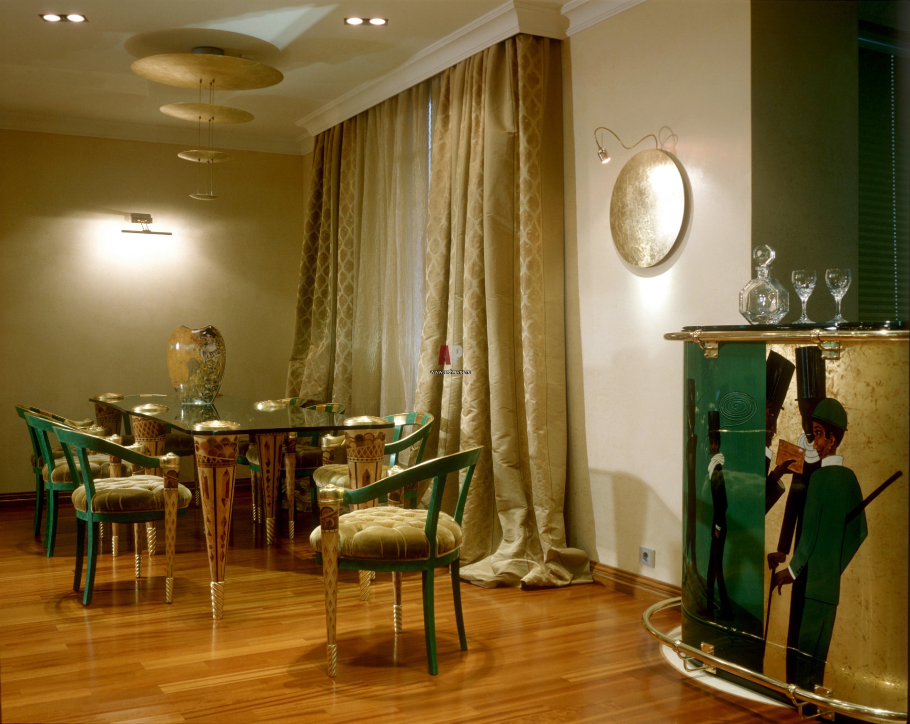Зона бара находится рядом с обеденным столом. На фасаде барной стойки изображена сцена из парижской жизни начала ХХ века. Мебель, Colombostile.