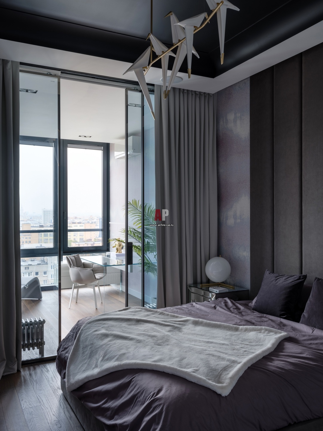 Спальня отделена от кабинета в эркере стеклянными перегородками. Зона спальни выделена повышением потолка, он выкрашен в графитовый цвет для достижения еще большего эффекта высоты. Подвесной светильник, MOOOI, модель Perch, дизайн Умута Ямака.