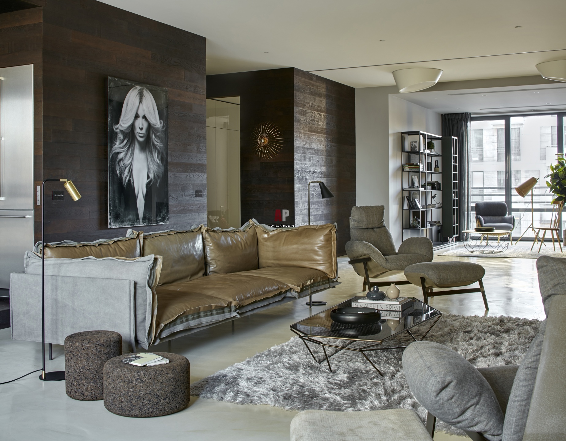 Интерьер гостиной с эко-мотивами. Одна стена зашита деревянной доской из темного дуба. Пол – нейтральный, из полимерного композитного материала. Диван, Arketipo. Столик, Vitra. Столики из пробки, MOOOI. Кресло, Luca Nichetto. Торшеры, Rubn. Бра, Autoban.