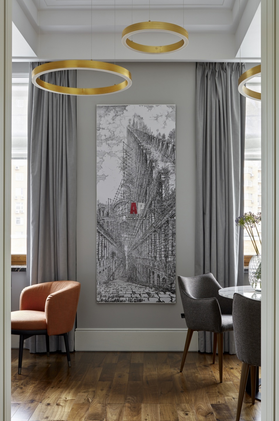 Интерьер небольшой однокомнатной квартиры. Картина «Лестница в небо», Михаил Филиппов при участии Василия Пака. Калька, тушь, кисть, перо, 1996.