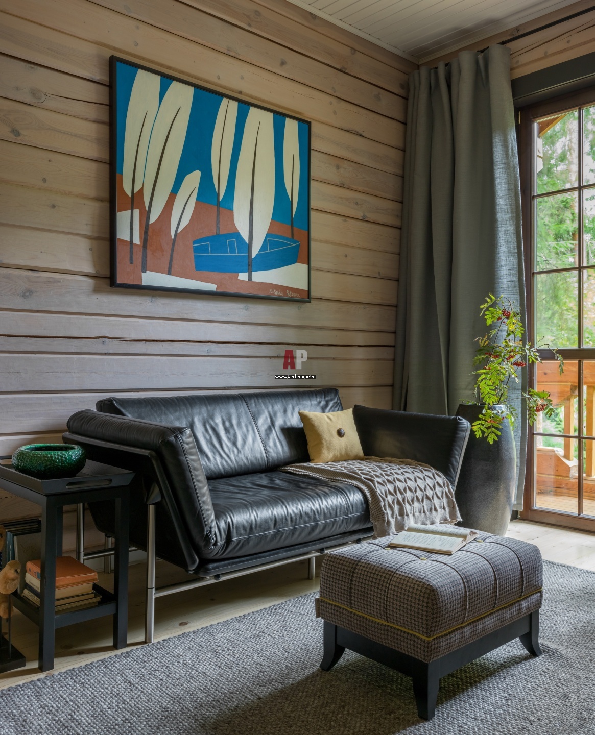 Камерная зона отдыха в библиотеке. Тумба, Dantone Home. Кожаный диван, винтаж. Картина «Лодки» работы художницы Наталии Петровой.