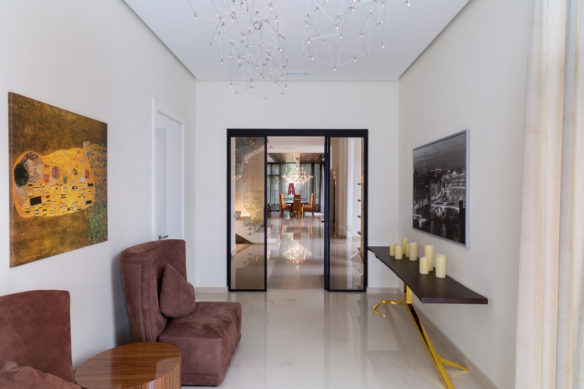 Интерьер холла. Помещения в доме отделены раздвижными стеклянными дверями, отсутствие глухих дверей обеспечивают плану открытость. Светильник, Quasar.