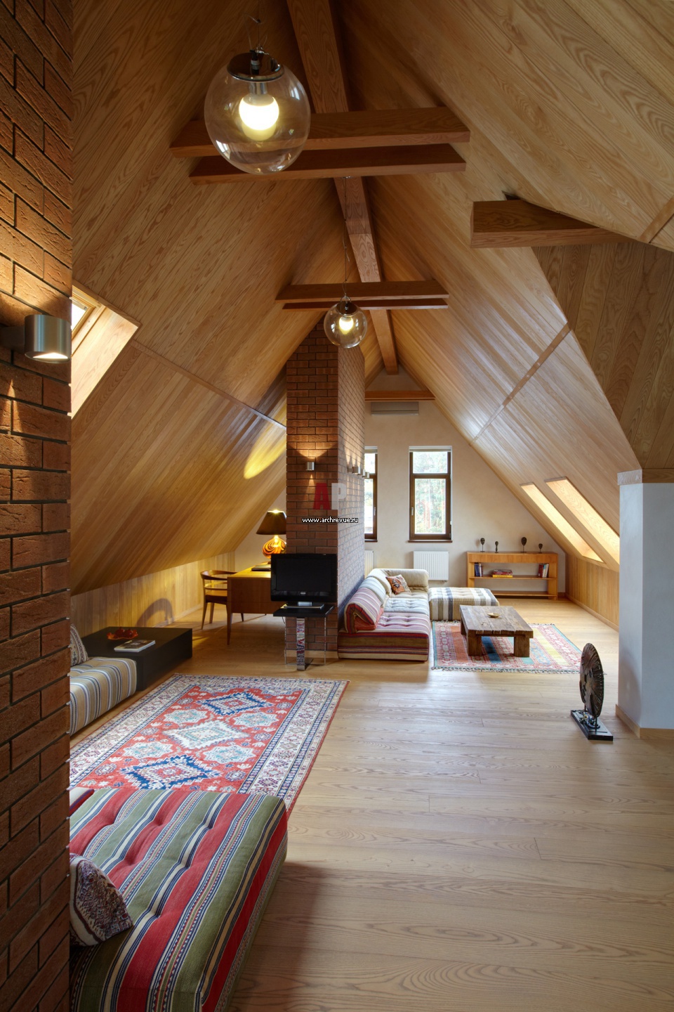Зона отдыха в мансарде с крутыми скатами кровли. Потолок подшит доской ясеня. Два каминных дымохода облицованы клинкерной плиткой, как на фасаде. Полосатая мебель в марокканском стиле.