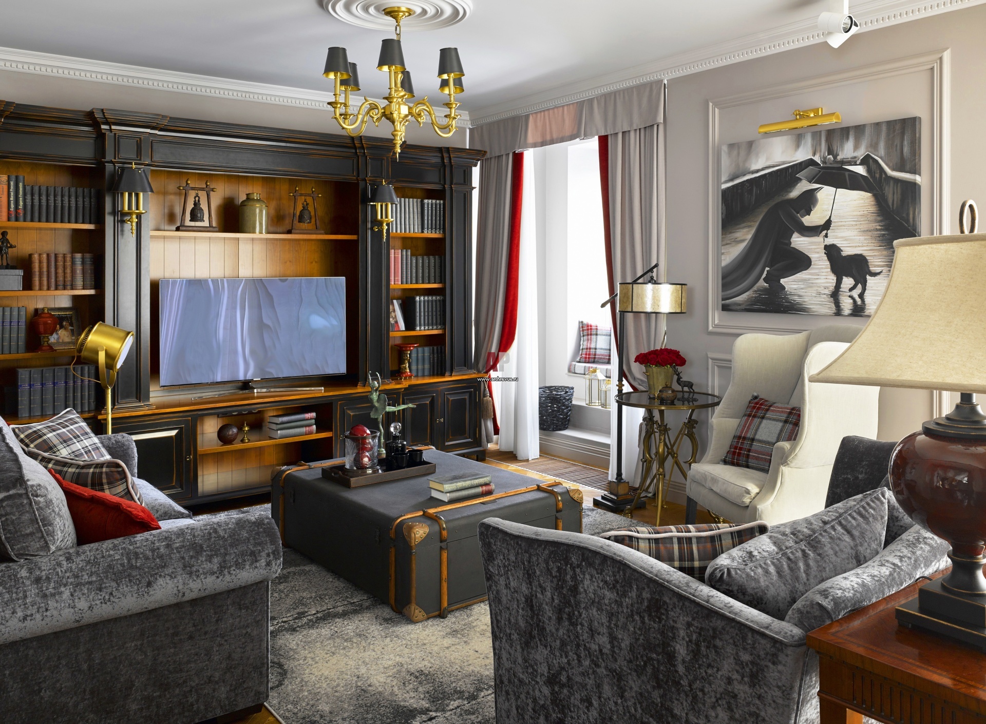 Интерьер гостиной с элементами американской классики и деталями в колониальном стиле. Шкафы в зоне ТВ с эффектом состаренного дерева, AM Classic. Диваны в темно-серой бархатной обивке, Parker Knoll. Люстра, Artemis Home.