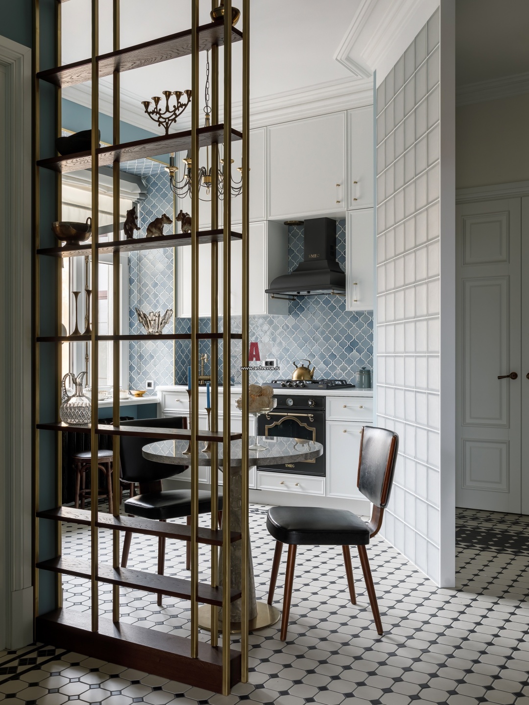 Кухня. Стеклоблоки – неожиданный контраст в интерьере, они пропускают свет в зону прихожей и в то же время прекрасно выполняют функцию разграничения двух зон. На полу – керамическая плитка, TopCer.