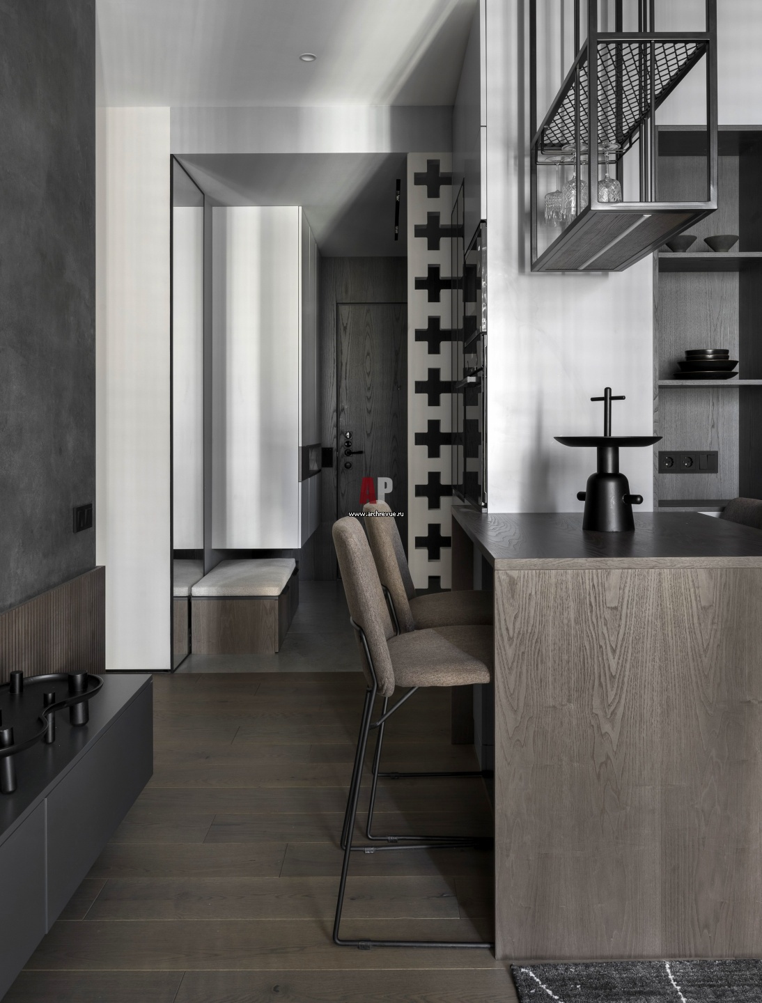 Гостевая квартира с темной палитрой и брутальными фактурами