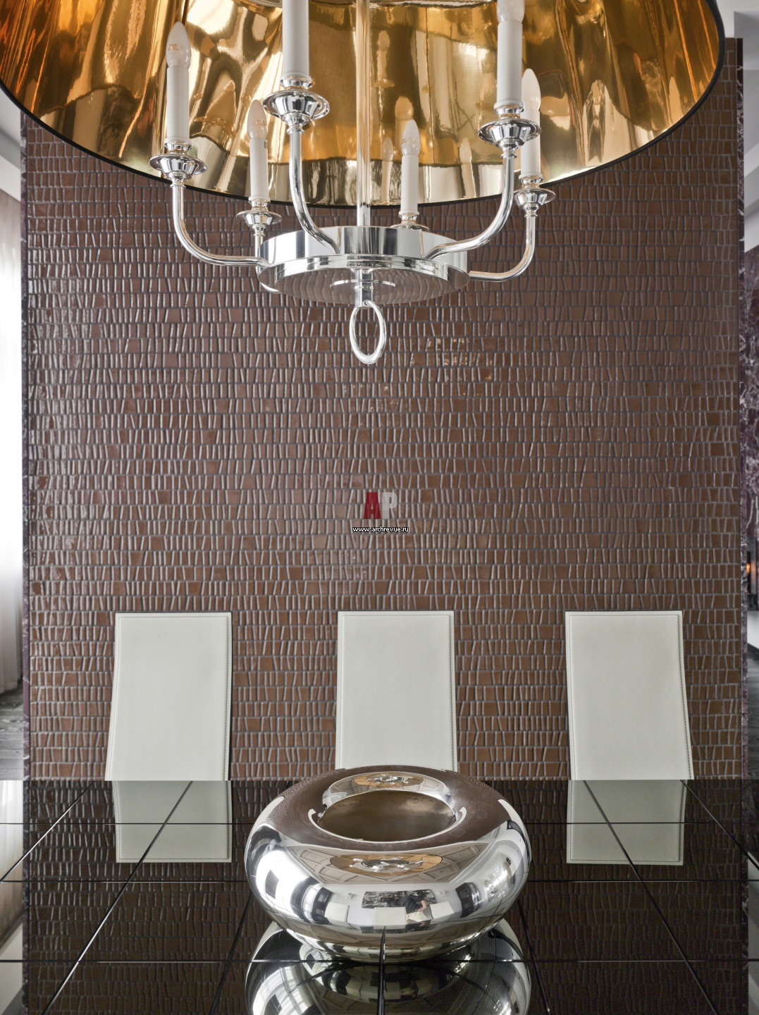 Со стороны столовой перегородка отделана керамической мозаикой, набранной из гянцевых тессер неправильной формы.