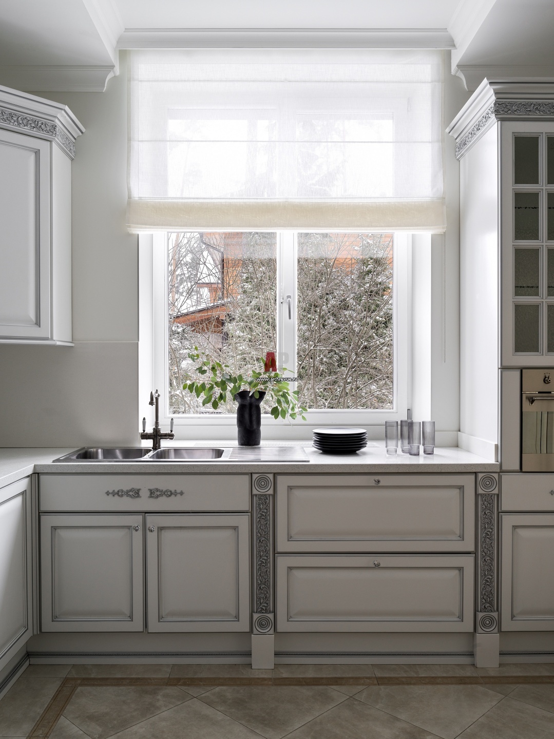 За счет нейтральной палитры классический кухонный гарнитур выглядит уместно в интерьере с новой концепцией.