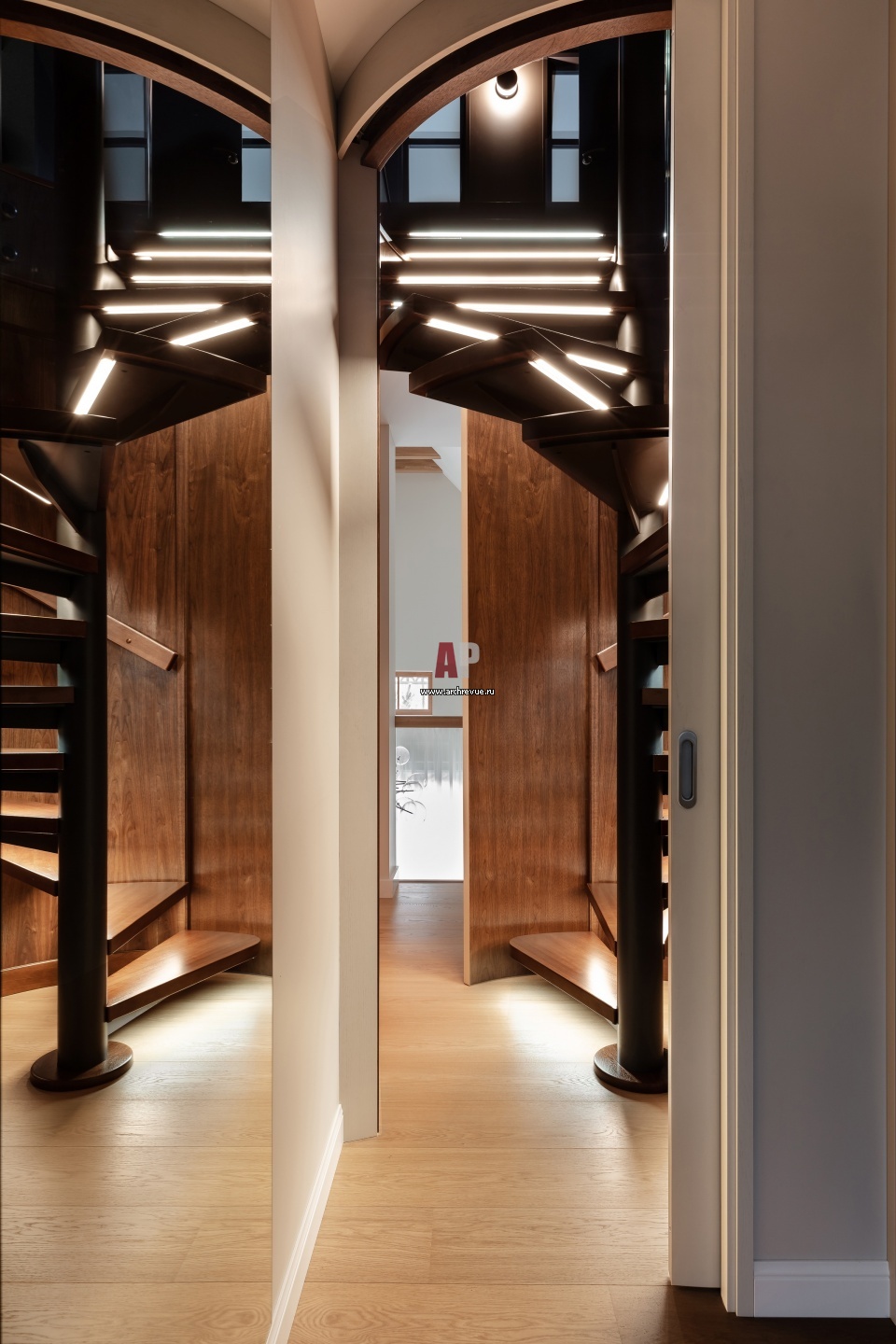 В мансарду ведет скрытая винтовая лестница. От холла и хозяйской гардеробной она изолирована радиусными раздвижными дверями.