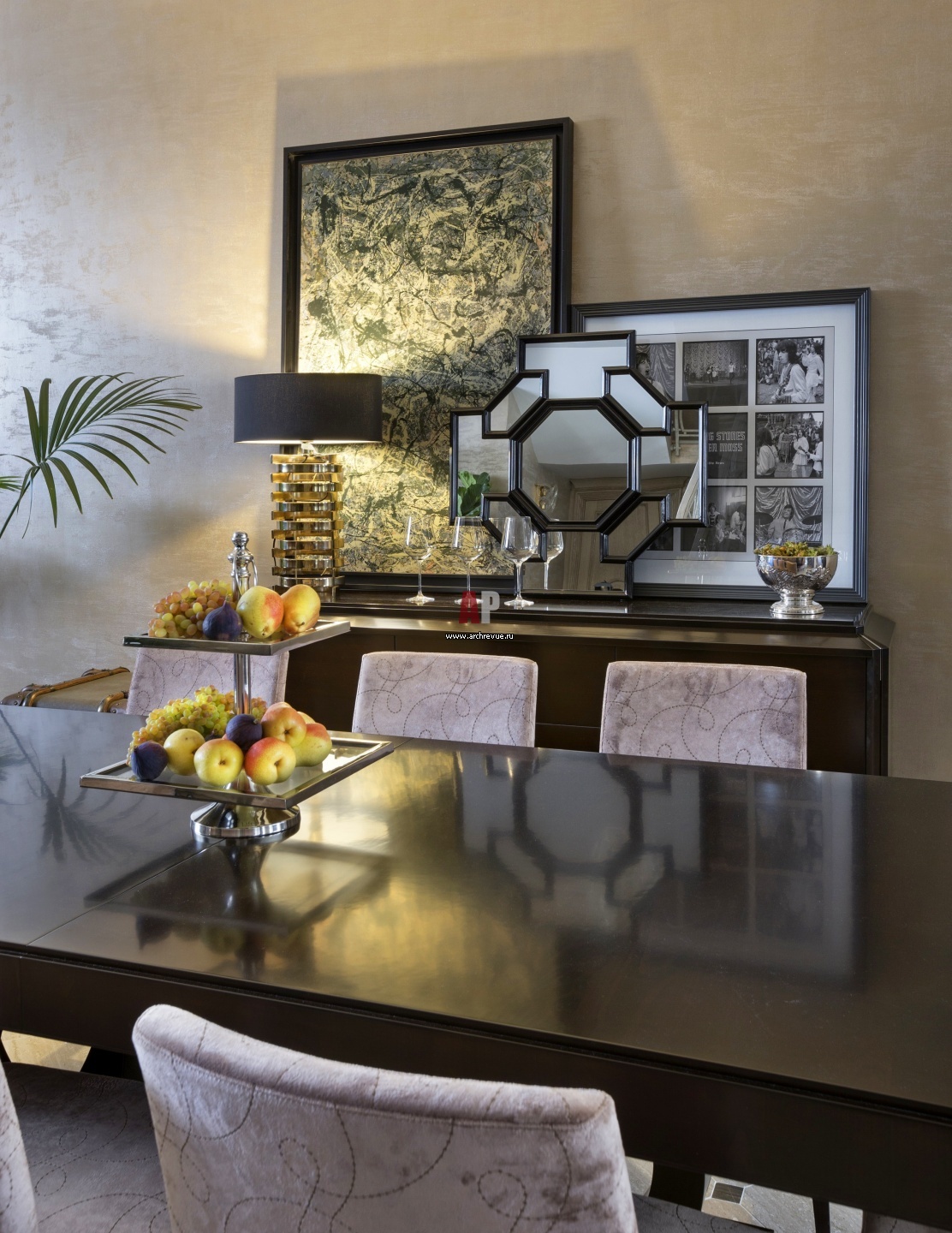 Для декора столовой выбраны предметы в стиле ар-деко: настольная лампа и зеркало, которые прекрасно сочетаются с копией полотна Джексона Поллока и редкими фотографиями The Rolling Stones.
