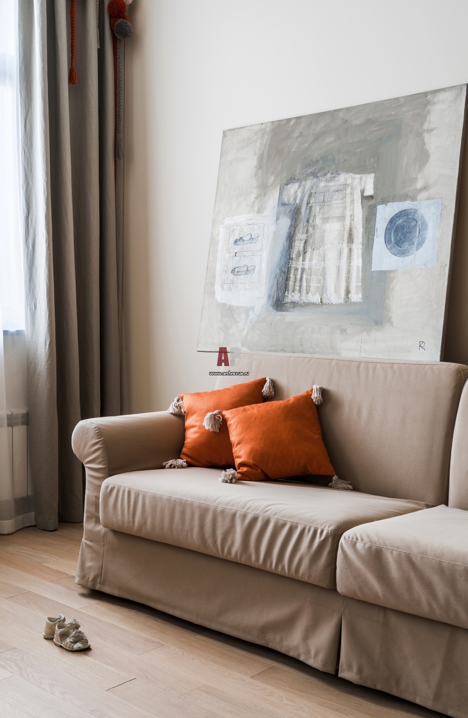 Монохромная квартира в теплой палитре. Интерьер детской. Живопись Екатерины Рожковой.