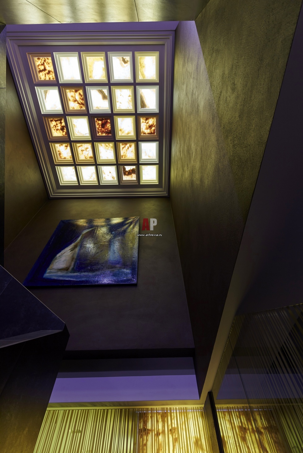 Лестничный холл украшен световым фонарем со вставками из оникса. Он дает мягкий, теплый свет.