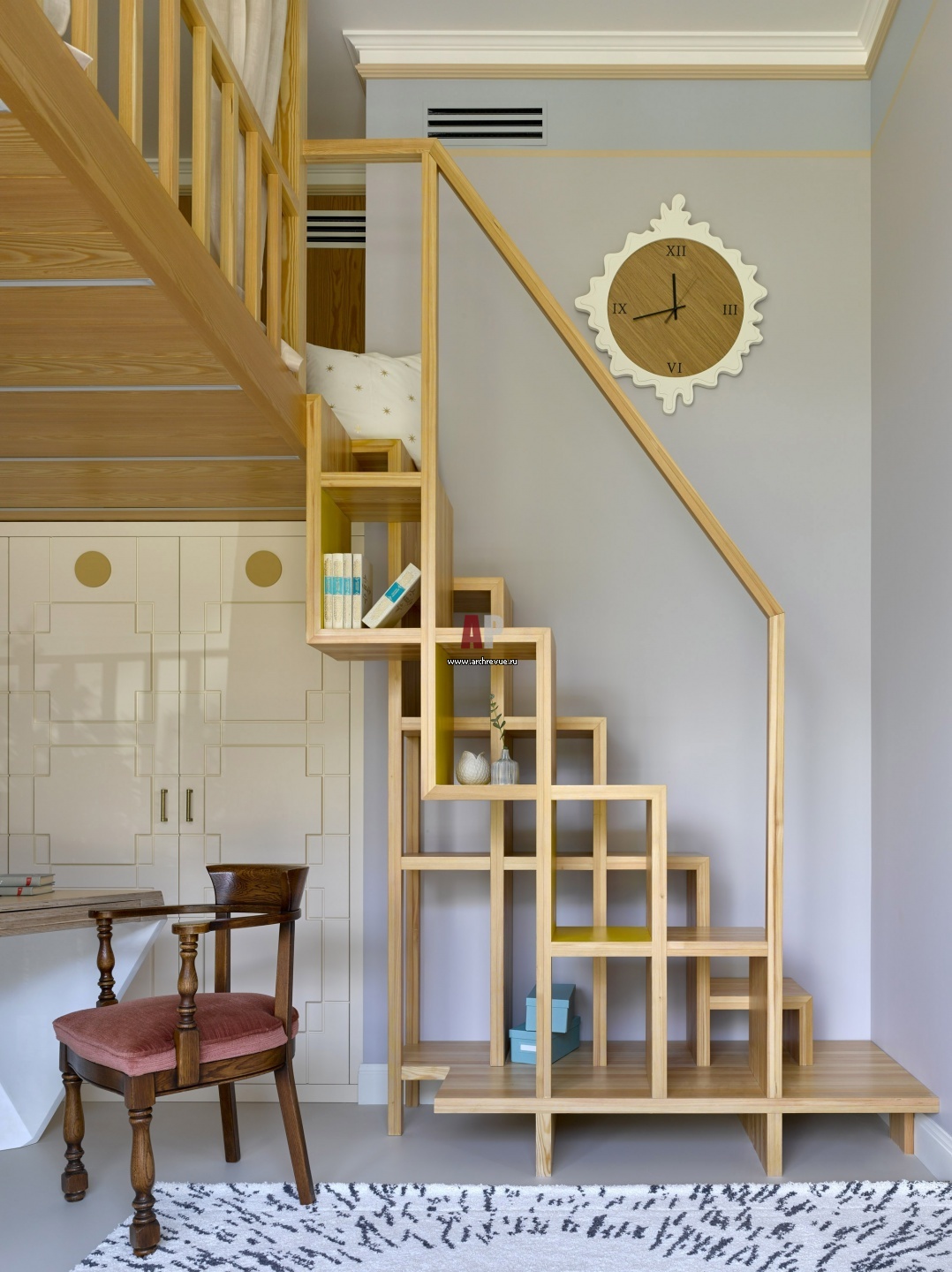 Большая высота потолка в гостевой спальне позволила организовать в ней подвесную кровать с лестницей-стеллажом и встроенным платяным шкафом, а также полноценной рабочей зоной, что позволяет использовать ее и как кабинет.