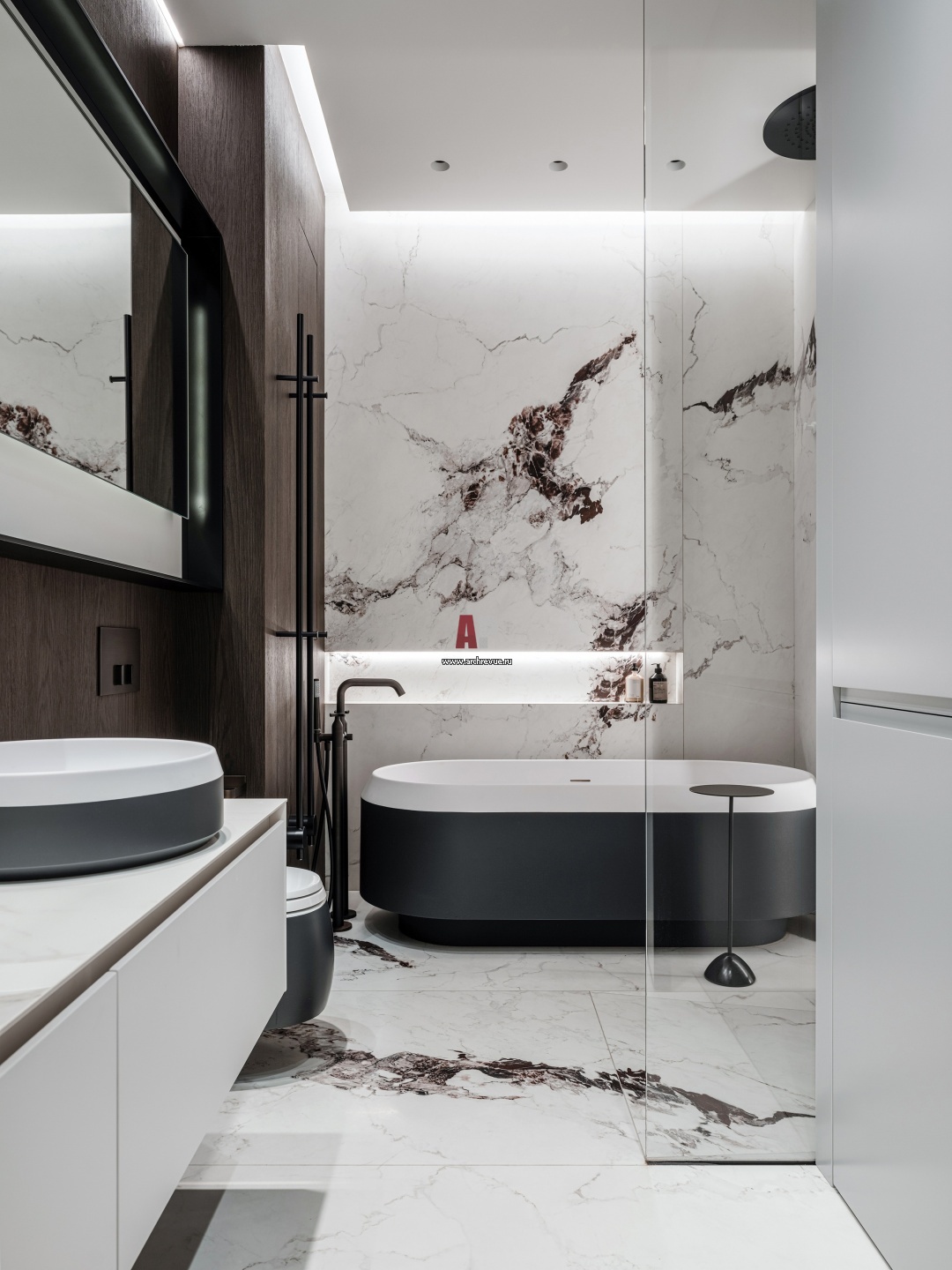 Хозяйская ванная комната. Во встроенных шкафах из темного дерева оборудована постирочная со стиральной и сушильной машинами, полками для хранения белья.