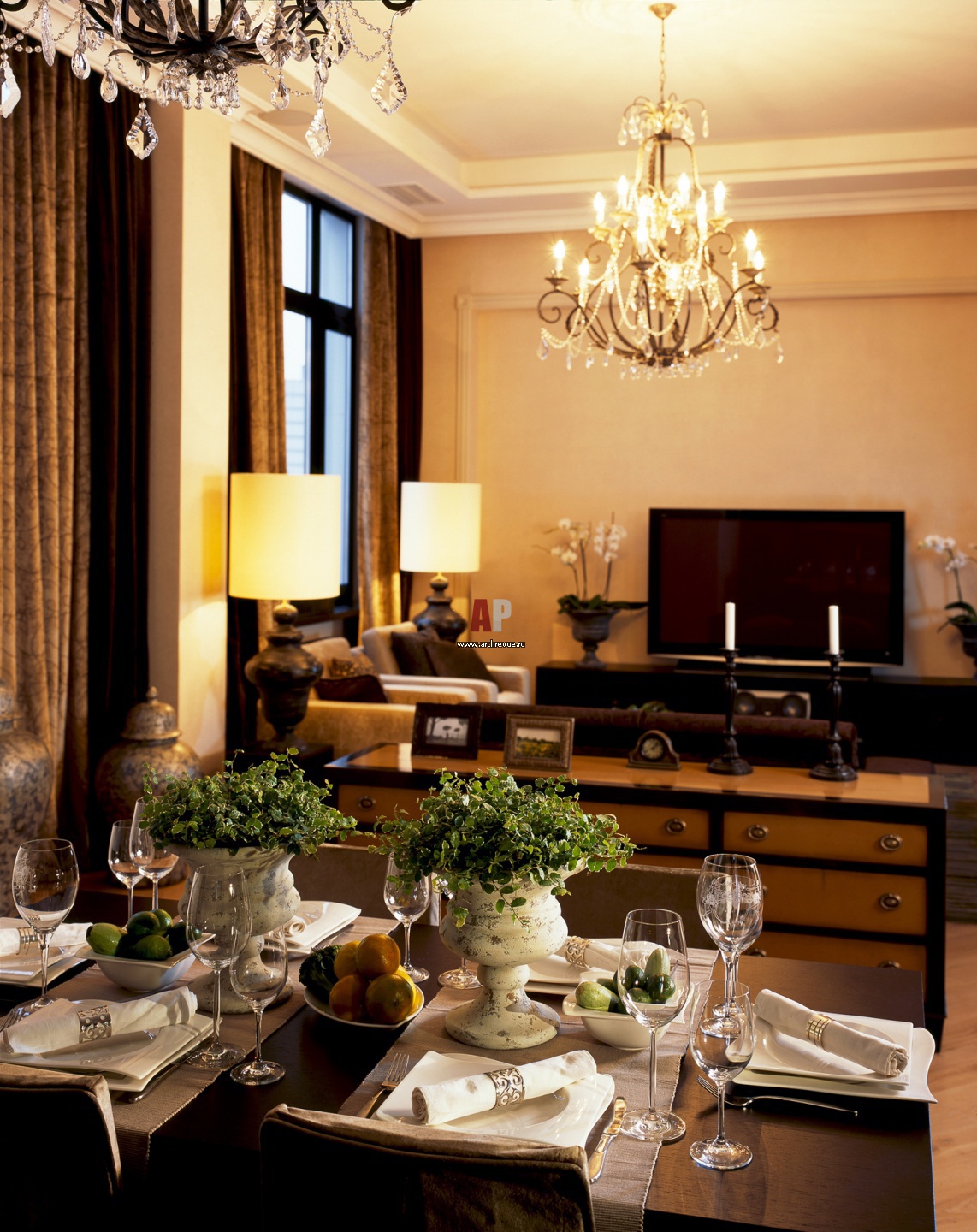 В общей зоне две парадные парные люстры Marioni обозначают зону гостиной и столовой.