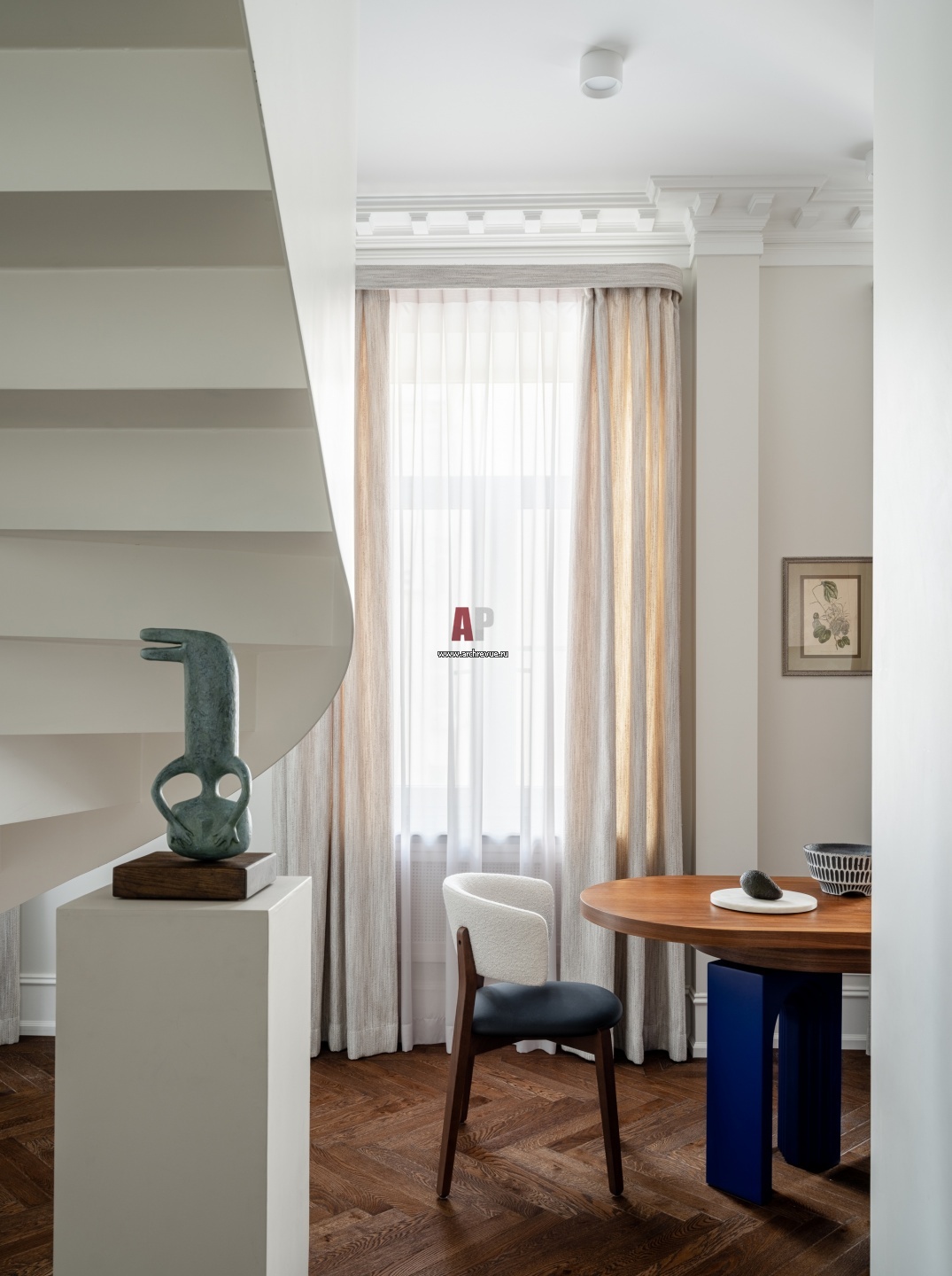 Эклектичная квартира с модернисткой лестницей и элементами неоклассики