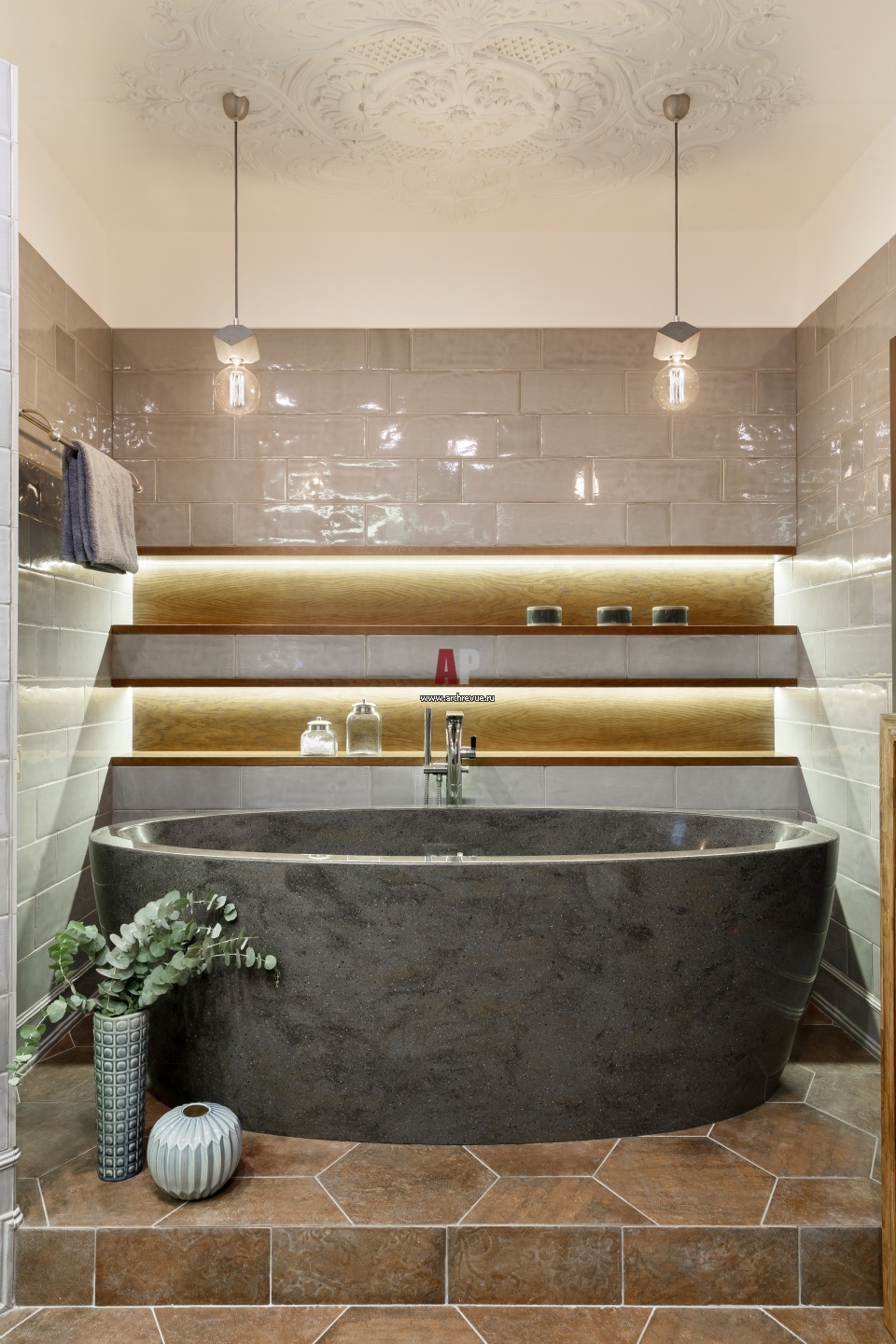 Интерьер хозяйской ванной комнаты. На подиуме – внушительных размеров отдельно стоящая ванна. Она выполнена по индивидуальному проекту из акрилового камня Corian Lava Rock и напоминает выточенную из цельной каменной глыбы.