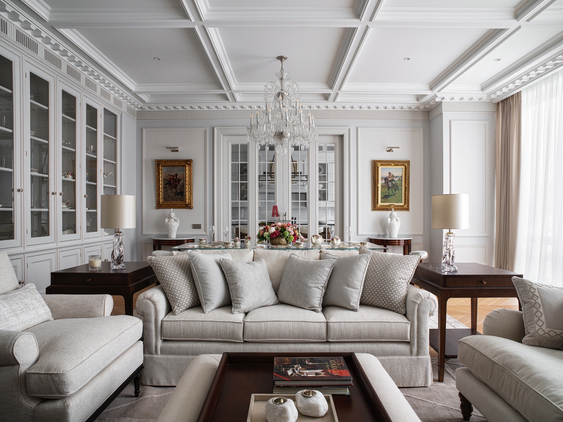 Гостиная. Диван, журнальный стол, Century Furniture. Кресла, Lillian August. Диван The Sofa & Chair Company. Люстра, Martinez Y Orts S.A. Лампа настольная, Bella Figura.
