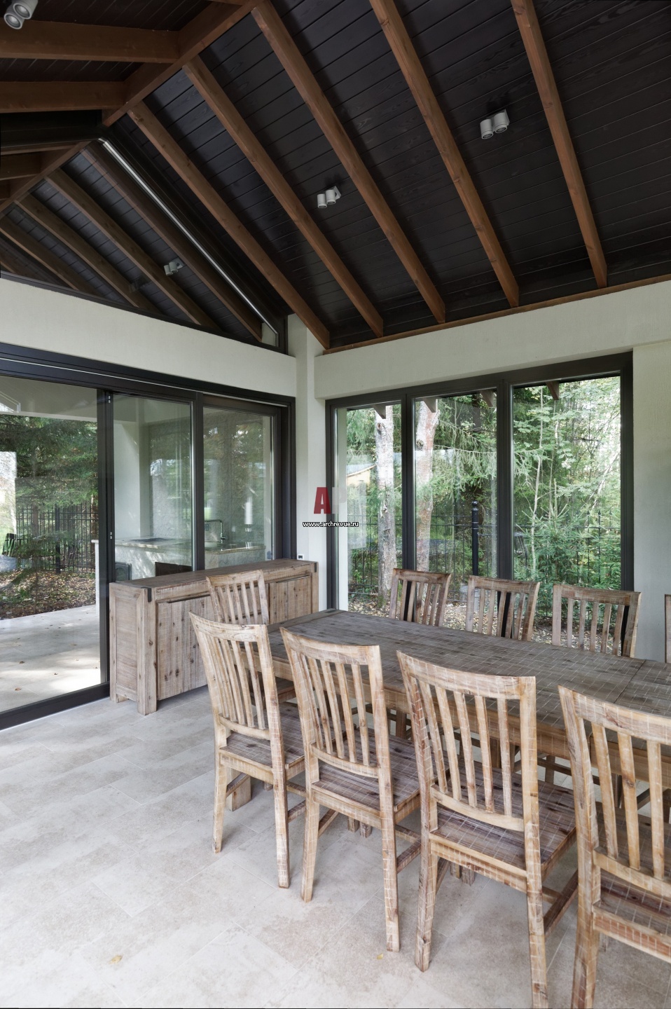 Павильон решен в стиле шале, он обставлен нарочито грубой мебелью.
