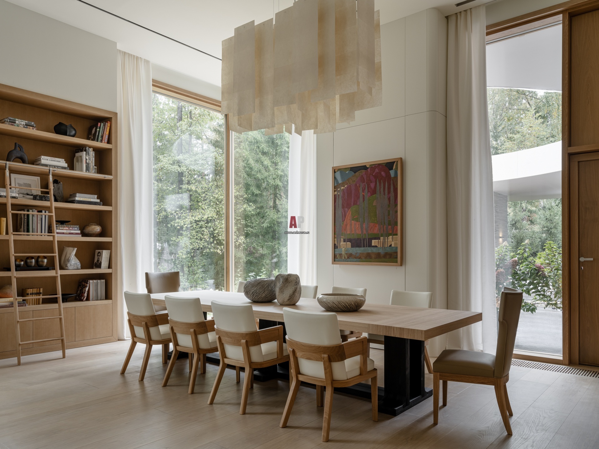 Столовая группа. Стол, стулья, Christian Liaigre. Люстра, Pallucco. Картина – художник Азам Атаханов.