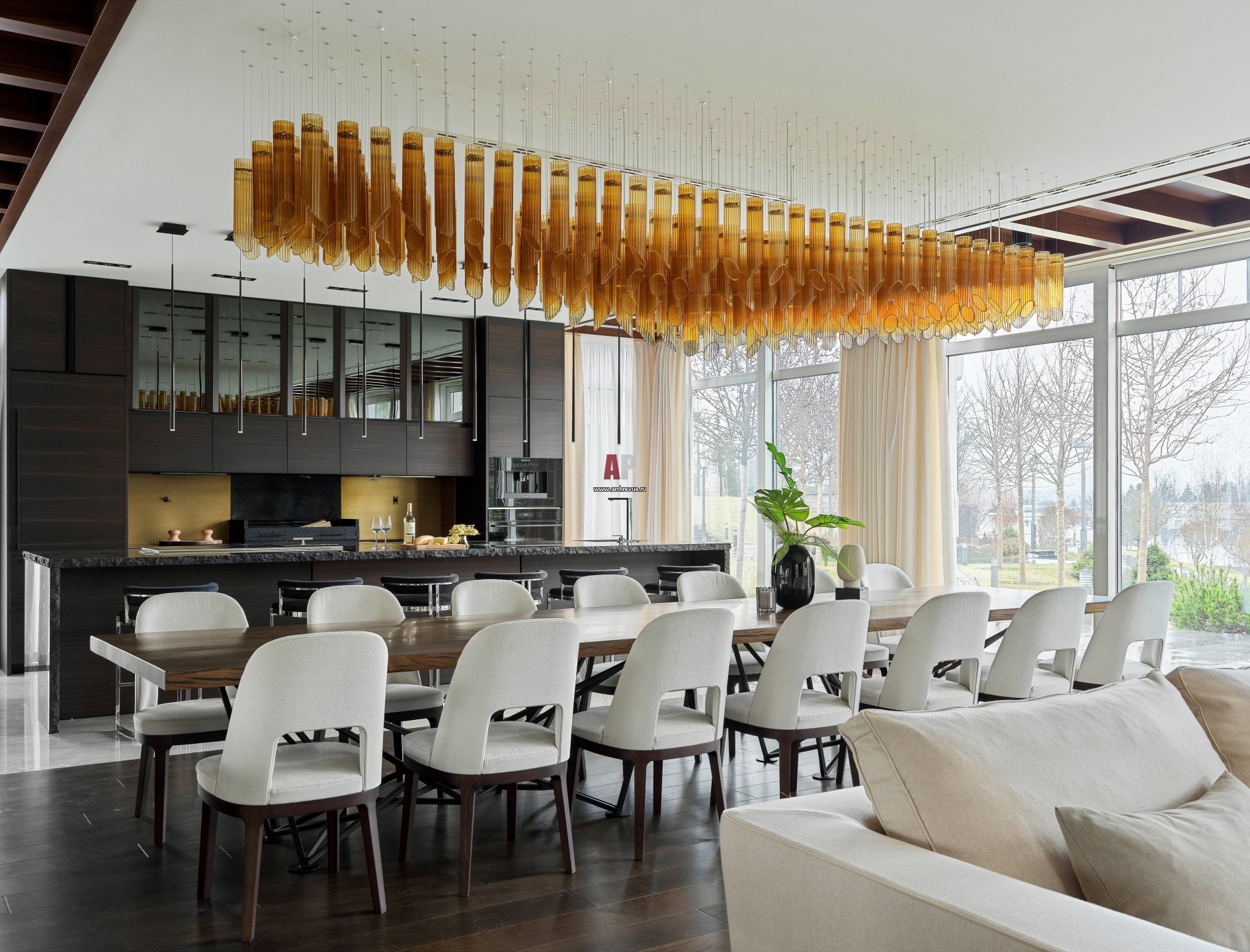 Эпатажный гостевой дом для ивентов и приемов. Интерьер кухни и столовой.