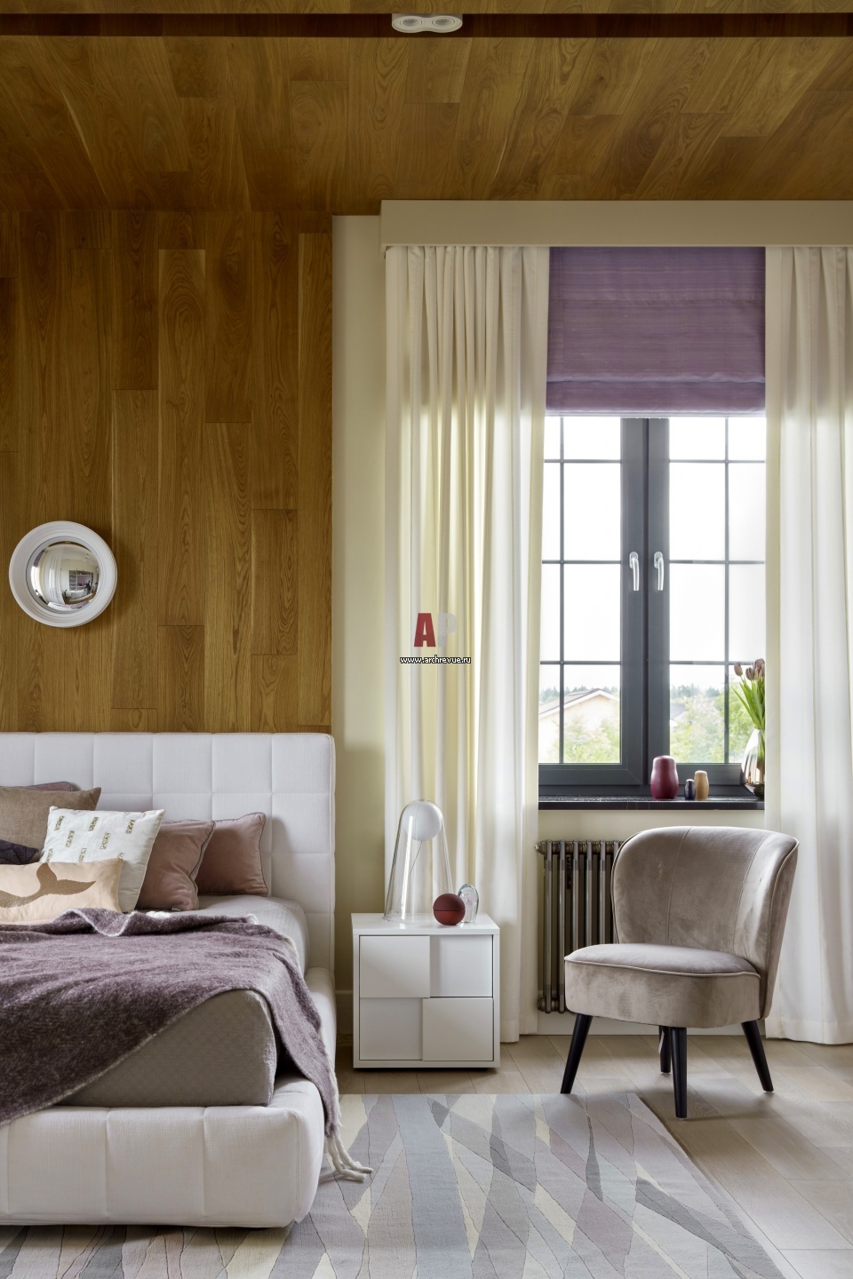 Современный дом с лаконичным дизайном и деревянными потолками. Спальня дочери. Кровать, Arketipo. Будуарное кресло, поставщик Urbanika.