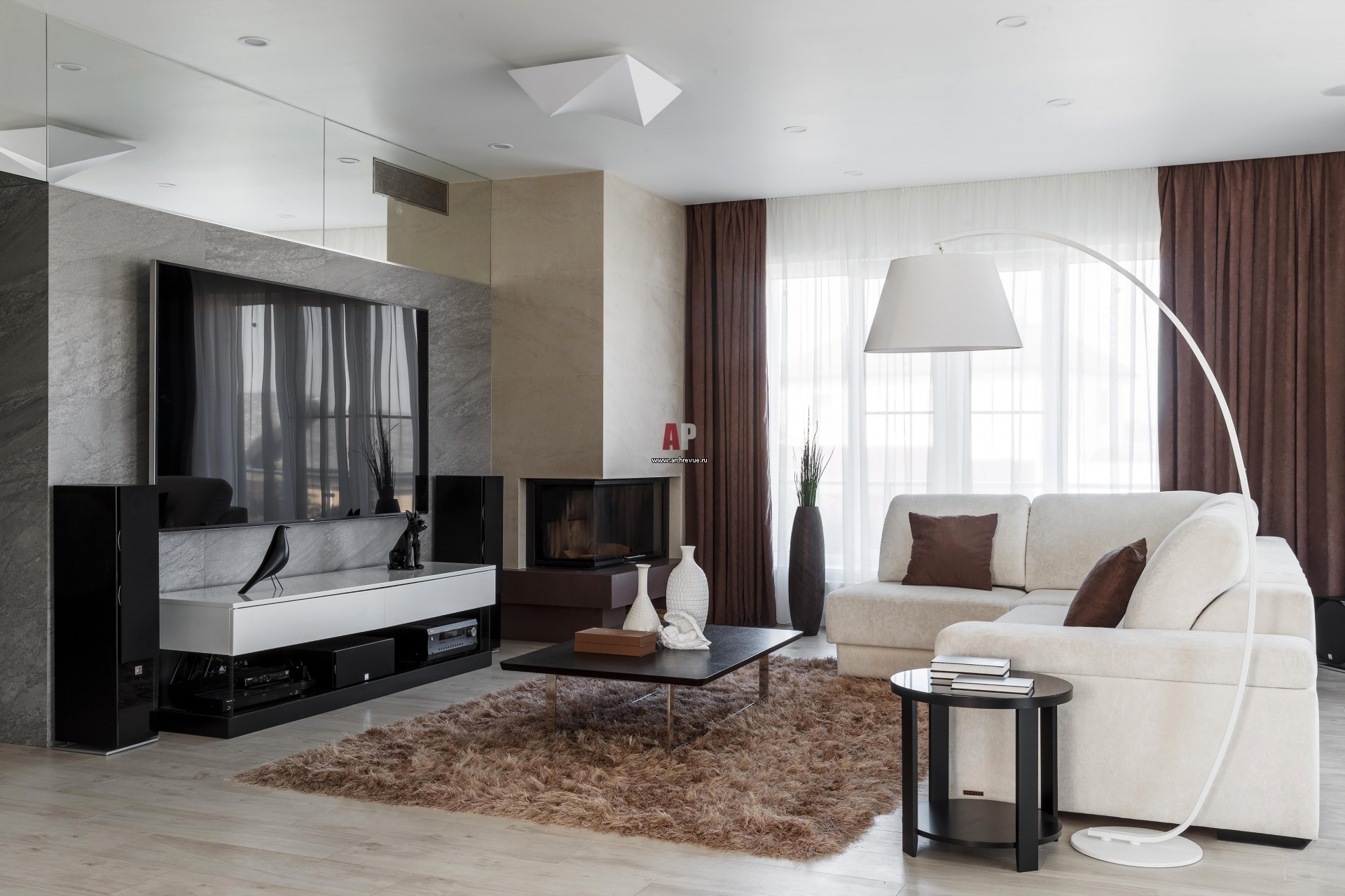 Фото дома Виталия Фридзона. Интерьер гостиной. Диван, Mobel & Zeit. Консоль под телевизор и столики, на заказ, по эскизам архитектора. Экран ТВ имеет диагональ 85 дюймов, акустическая система встроена в потолок. Люстра, Axo Light, модель Ukiyo G, дизайн Мануэля Вивиана.