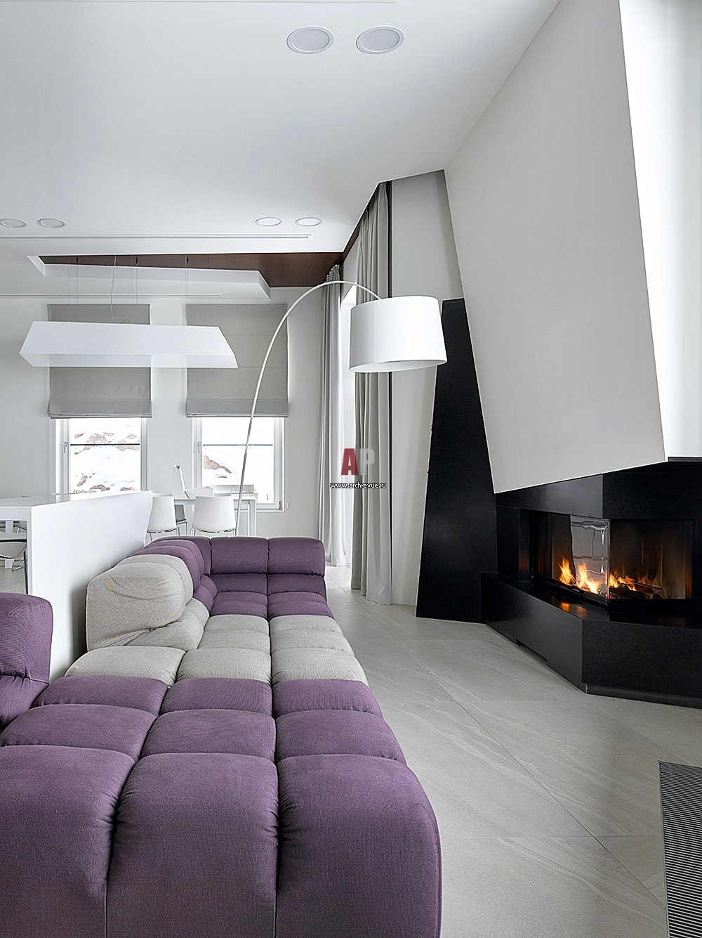 Интерьер минималистской гостиной выполнен в белых тонах. Диван B&B Italia в обивке пыльного фиолетового цвета.