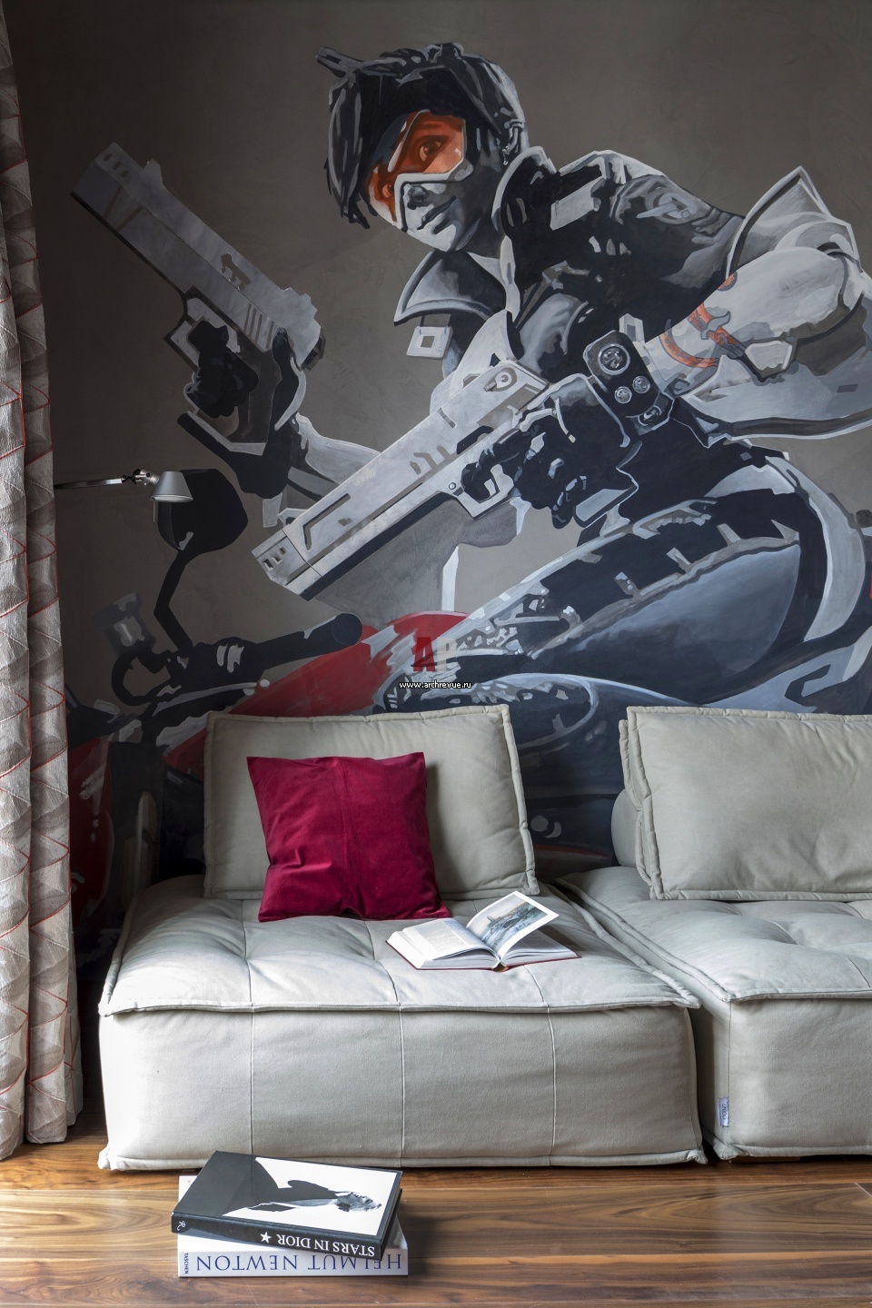 В квартире есть «секретная» комната (она же кабинет хозяйки), попасть в которую можно из кухни. Благодаря усиленной звукоизоляции в ней можно играть в видеоигры, петь караоке или просто побыть в тишине. На стене – граффити Василия Аникина с героиней компьютерной игры Overwatch – Tracer (Трейсер).