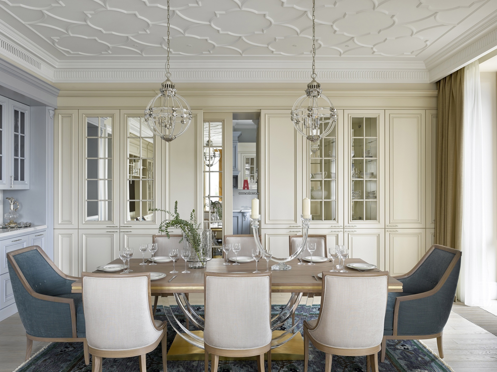 Парадная столовая. Мебель изготовлена на заказ. Стол, Century Furniture. Подвесные светильники, Eichholtz.