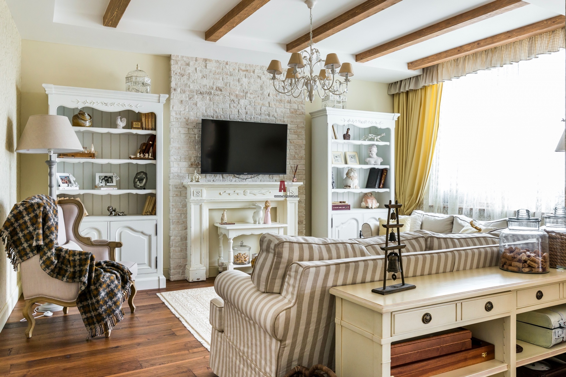 Зона отдыха в гостиной. Стены частично облицованы камнем с ярко выраженной фактурой. Потолок оформлен балками с брашировкой. Люстра, Eurolampart. Диван и кресла, LeHome. Комоды, стеллажи, Country Corner.
