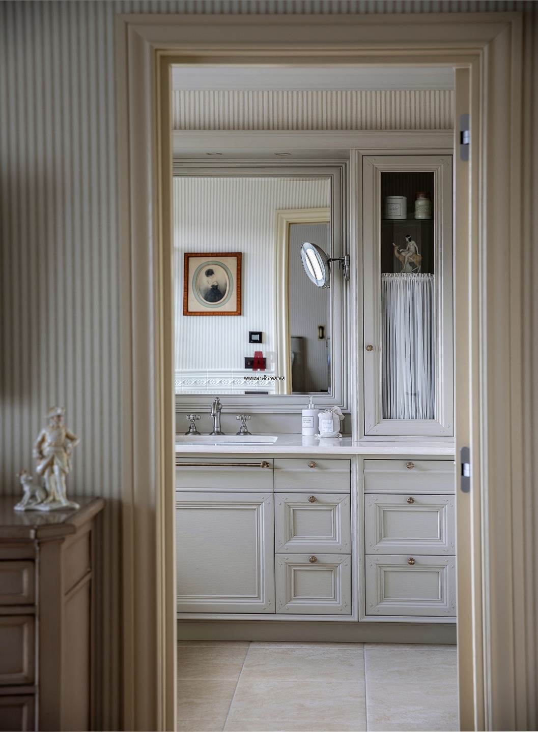 Вид из спальни на ванную комнату. В обоих помещениях светлые стены и много белой встроенной мебели, выполненной на заказ.