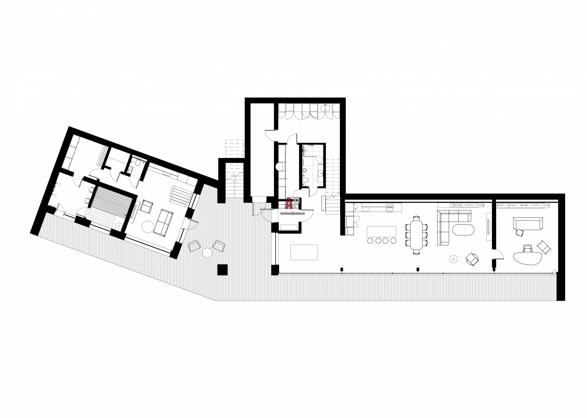 План первого этажа двухэтажного дома на склоне горы. Общая площадь – 506 кв. м.