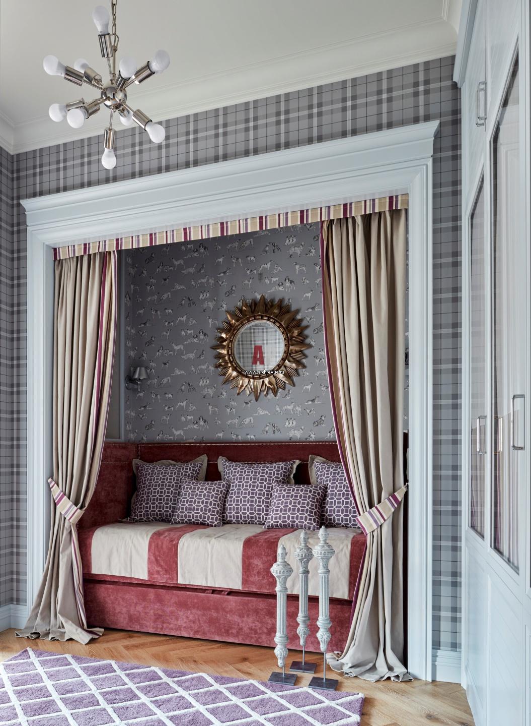 Интерьер детской с кроватью в нише. Кровать, встроенные шкафы, скамья с подушками выполнены по индивидуальным чертежам. Обои, Thibaut.