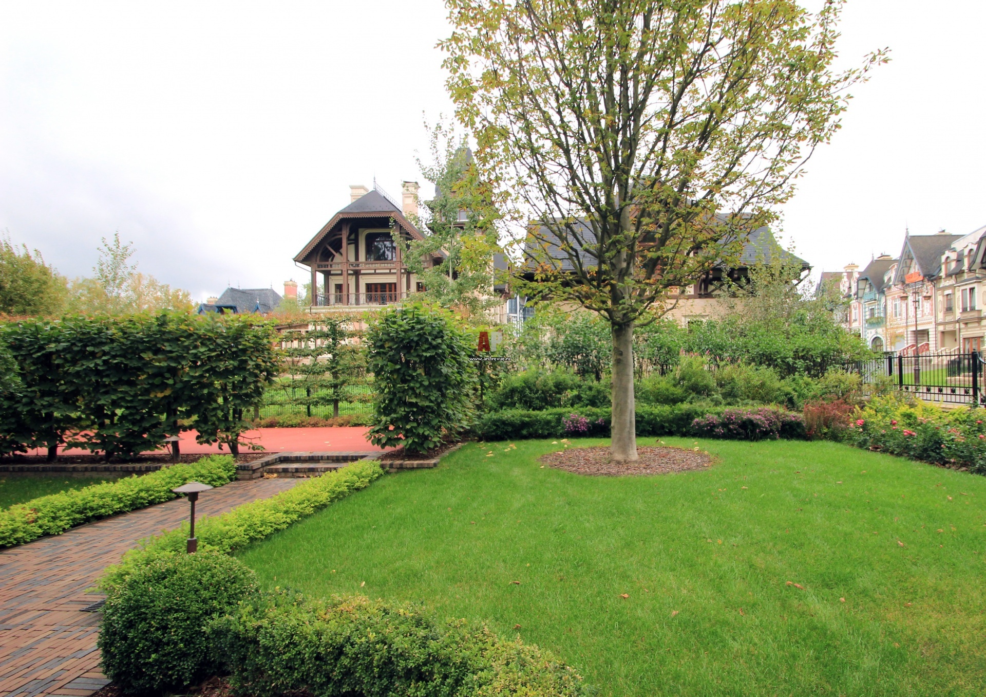 Справа от входа спроектирована спортивная зона с кортом для игры в бадминтон и спортивным покрытием. Со стороны дороги и от соседей она отделена многоярусными шпалерами из лип (6-7 ярусов веток), от парадной части ее изолируют изгороди из двухметровых стриженых лип на штамбе.