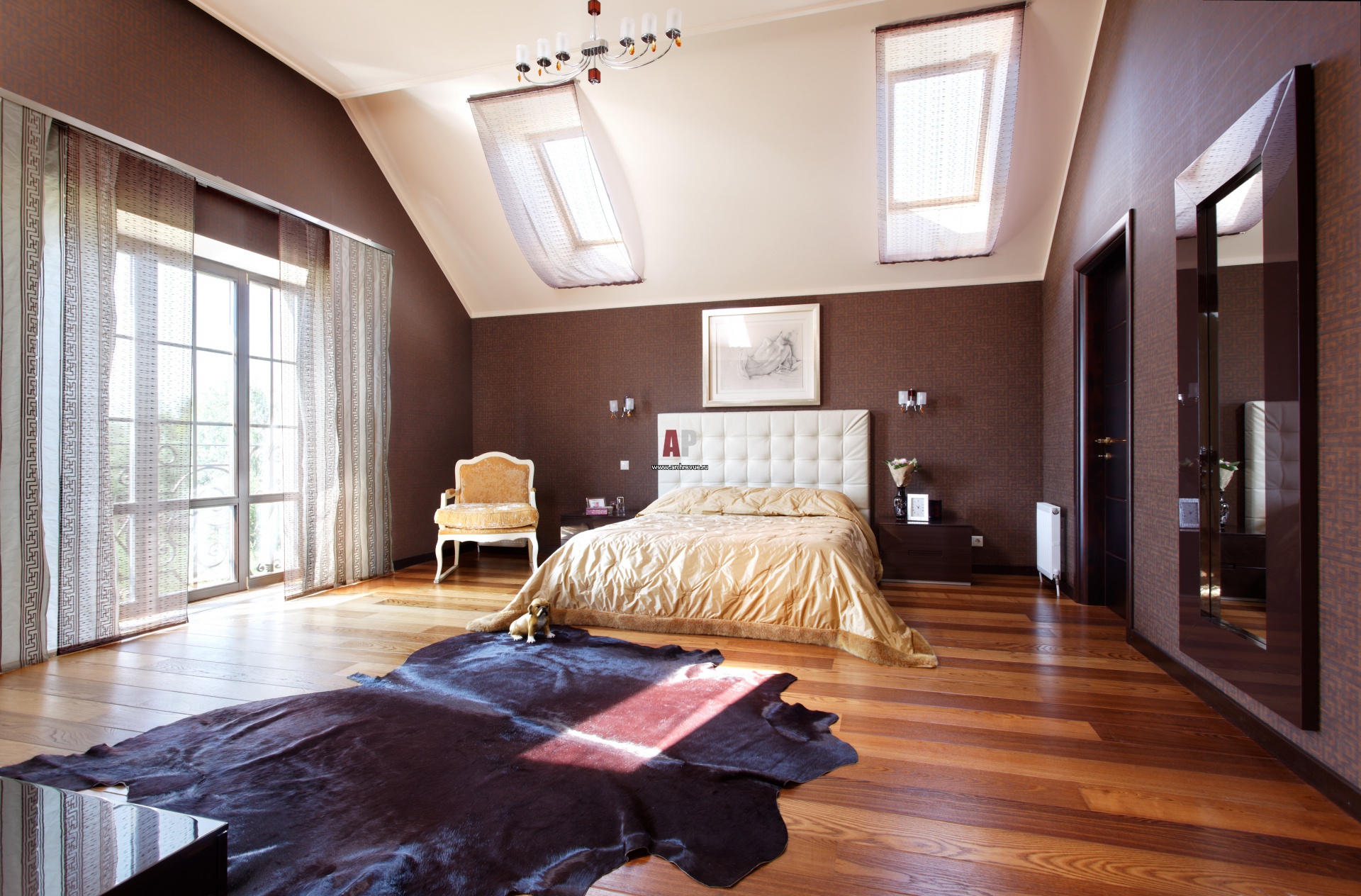Комната дочери решена в стиле мягкого минимализма. Французское окно с кованым балконом отсылает к европейским городским интерьерам. Обои шоколадного цвета с геометрическим рисунком. Широкая половая доска из древесины мербау.