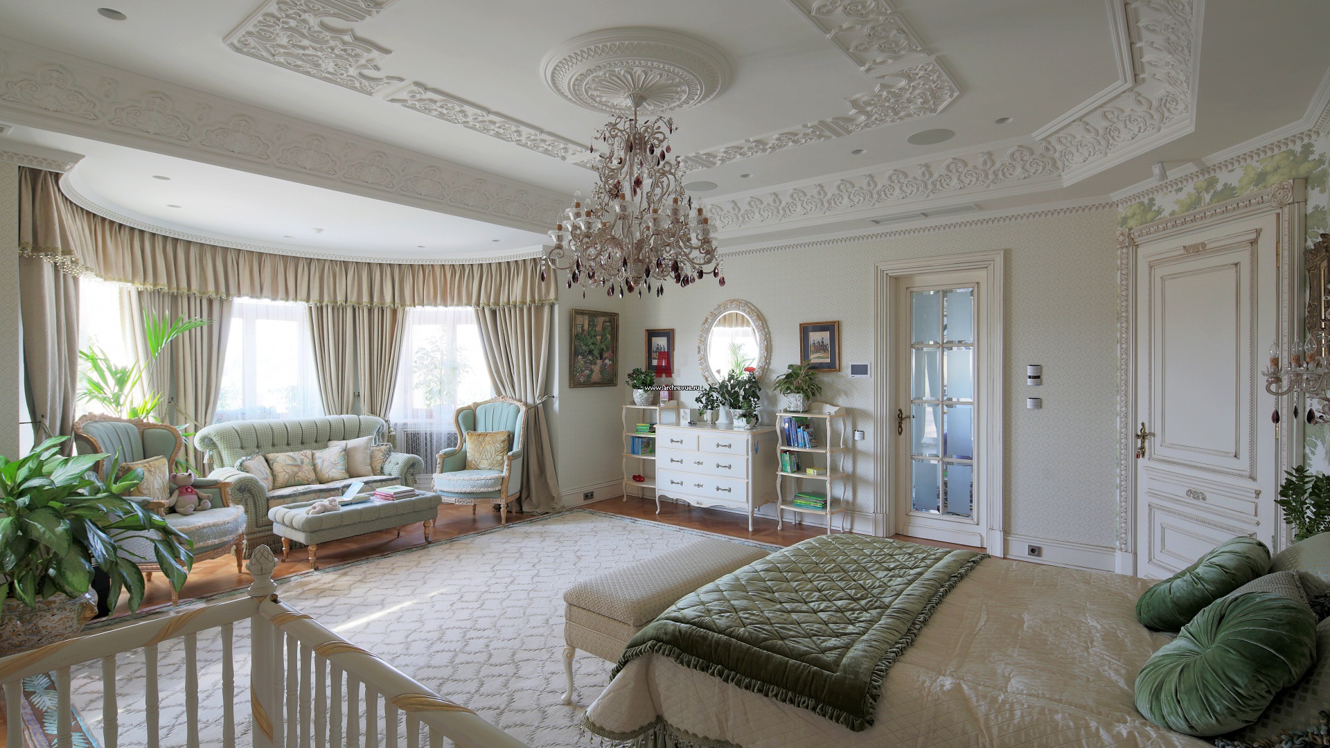 Детская комната в дворцовом стиле со свежими зелеными нотами. Потолочный лепной декор из гипса выполнен по авторским эскизам.