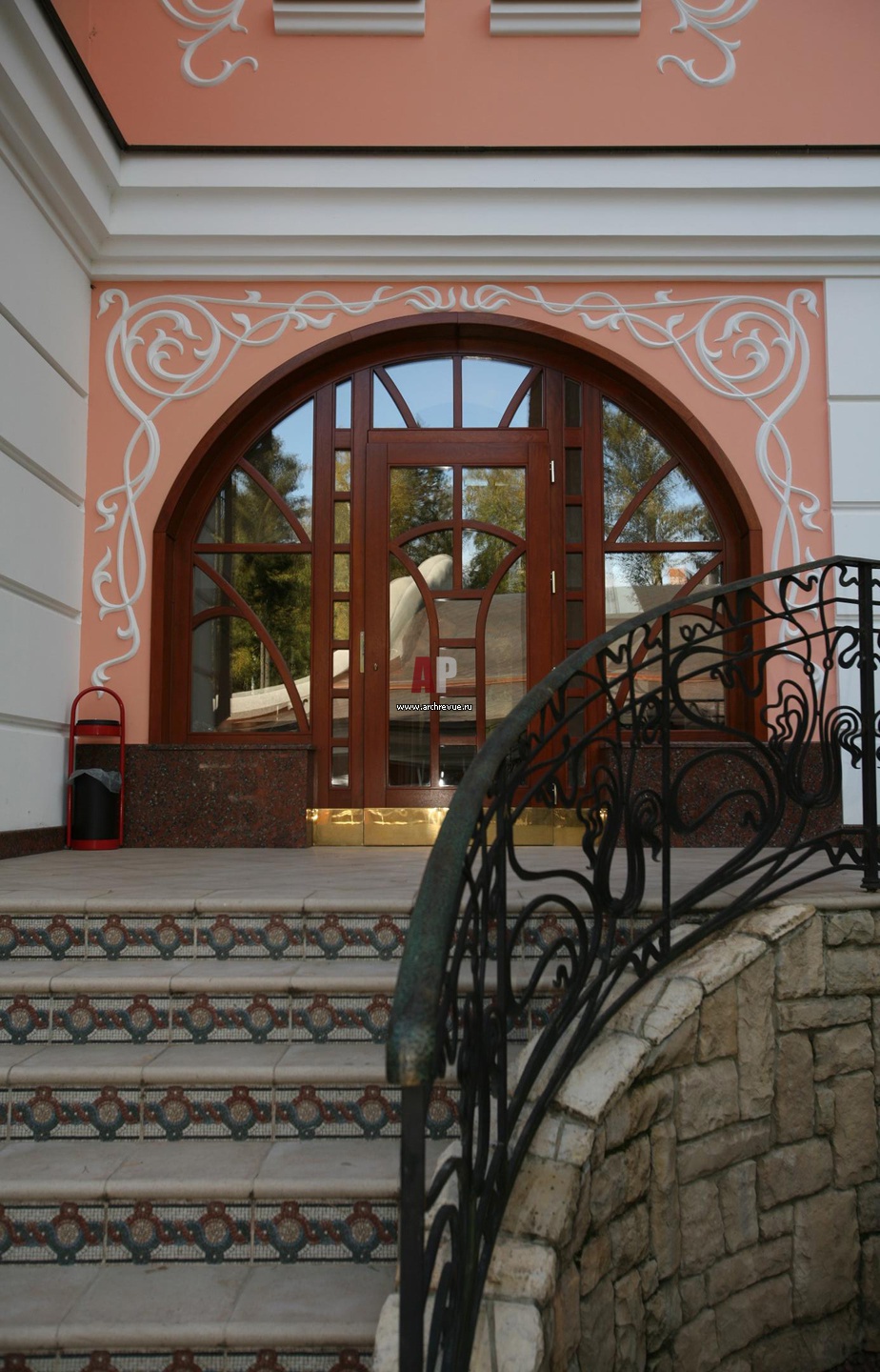 В распоряжение автора был предоставлен уже готовый бетонный трехэтажный особняк с окнами, некоторые особенности стилистики которого указывали на модерн. Автор доработал фасады, связав их с общей интерьерной концепцией.