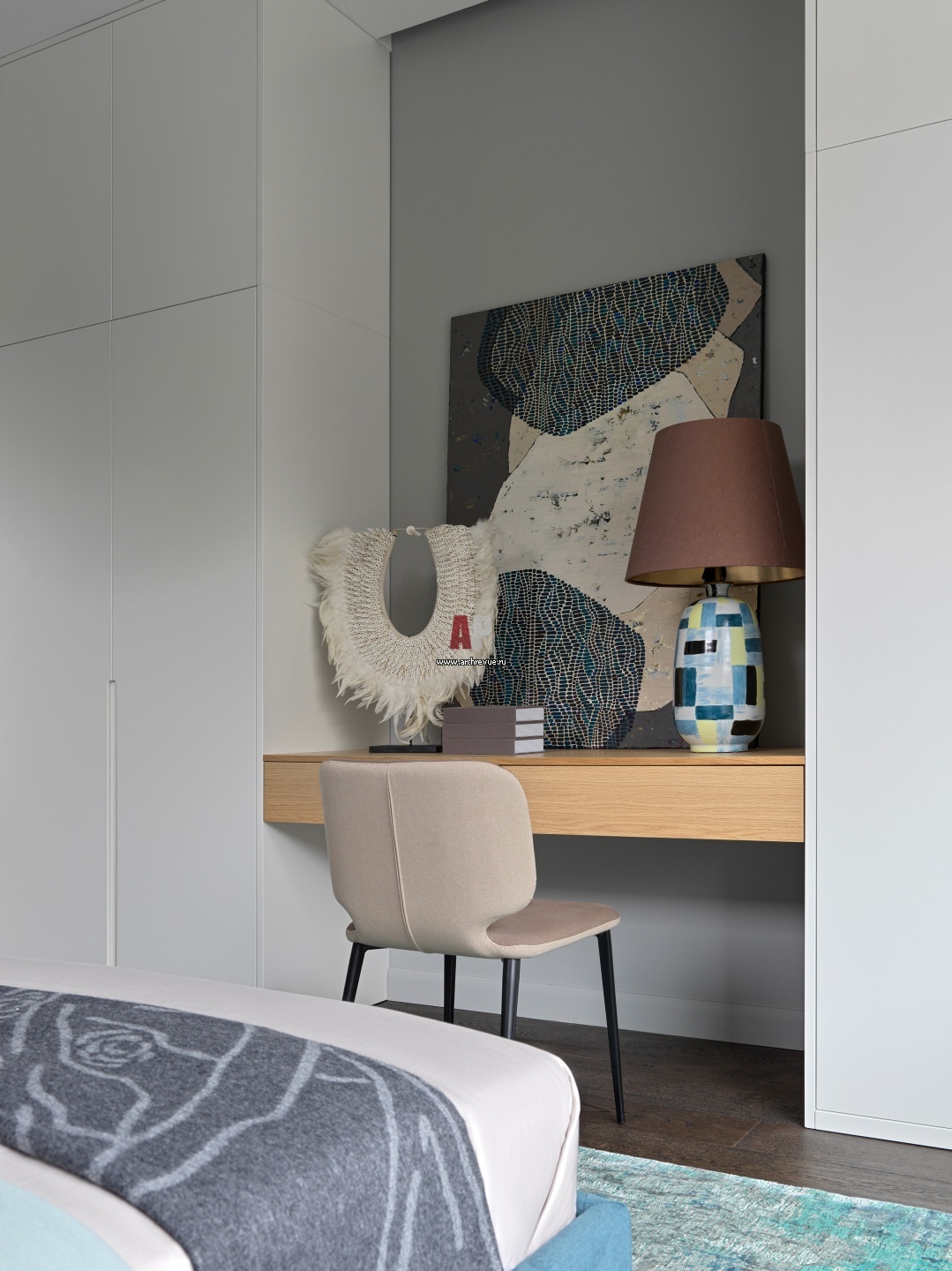 Двухэтажный современный дом для большой семьи. Интерьер гостевой спальни. Встроенные шкафы объединены консольным столом. Все столярные изделия сделаны на заказ.