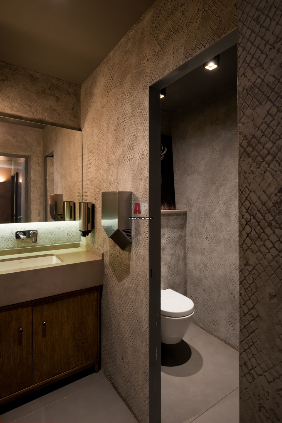 Стены в туалетных комнатах оформлены авторскими декоративными штукатурками с эффектом сырого бетона, на поверхности которого отпечаталась металлическая сетка.