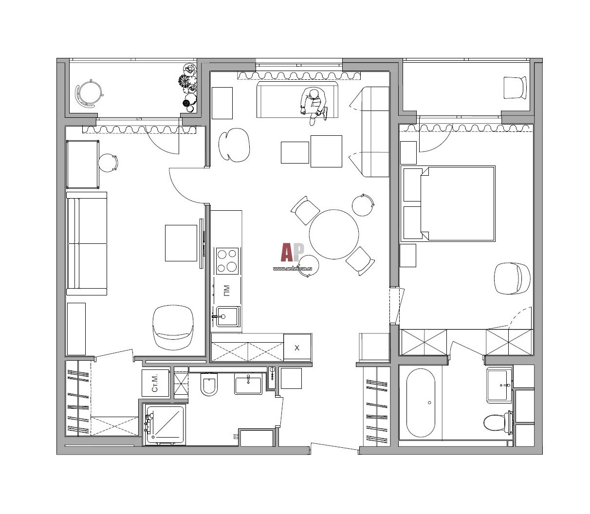 Планировка трехкомнатной квартиры в малоэтажном доме-новостройке в пригороде Санкт-Петербурга. Общая площадь – 74 кв. м.